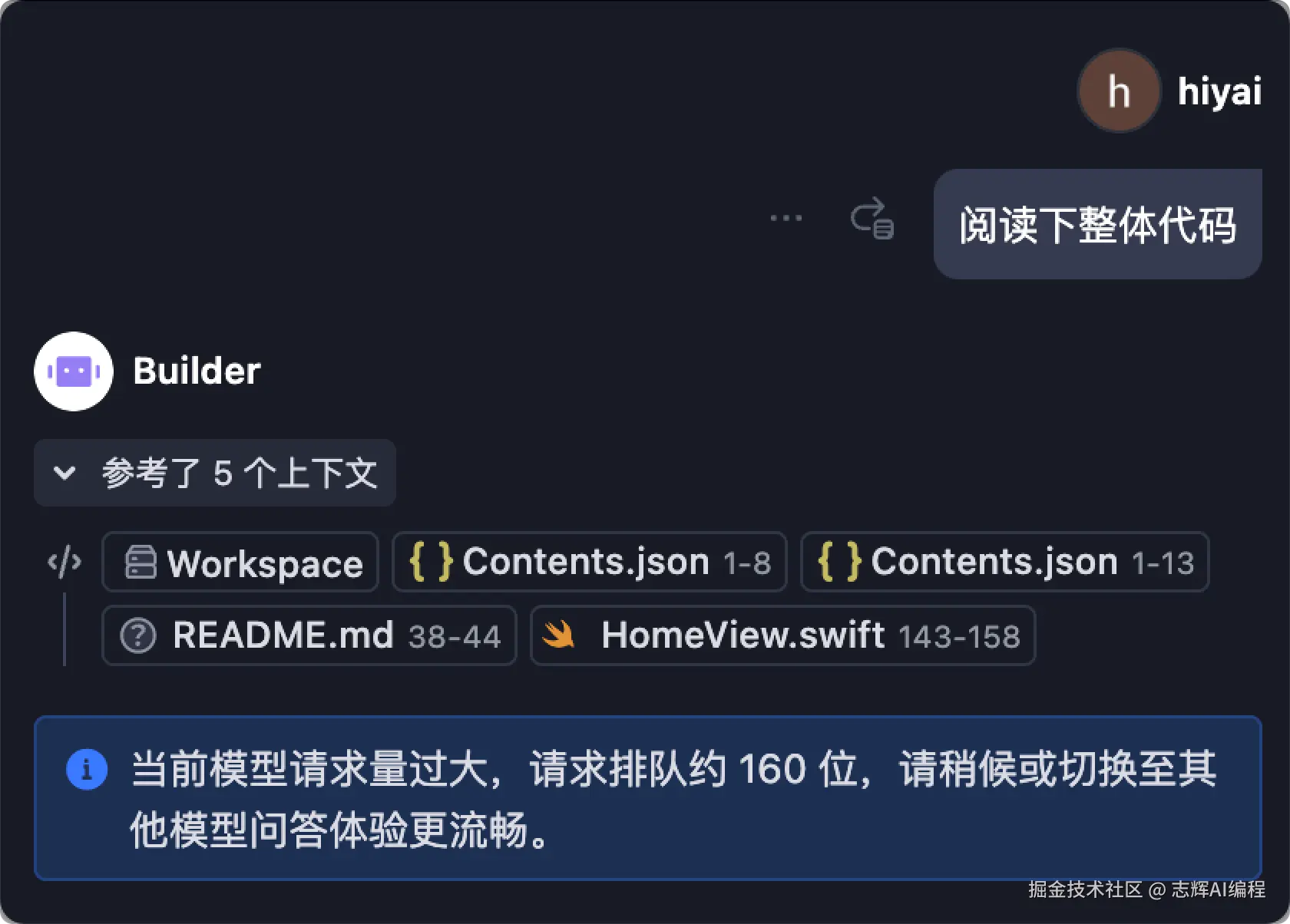 这个我就就直接那之前也是用 3.7 生成的 App 的代码来提问了。之前就是排队到 100 多明,我就直接放弃这个 App 的编写了。