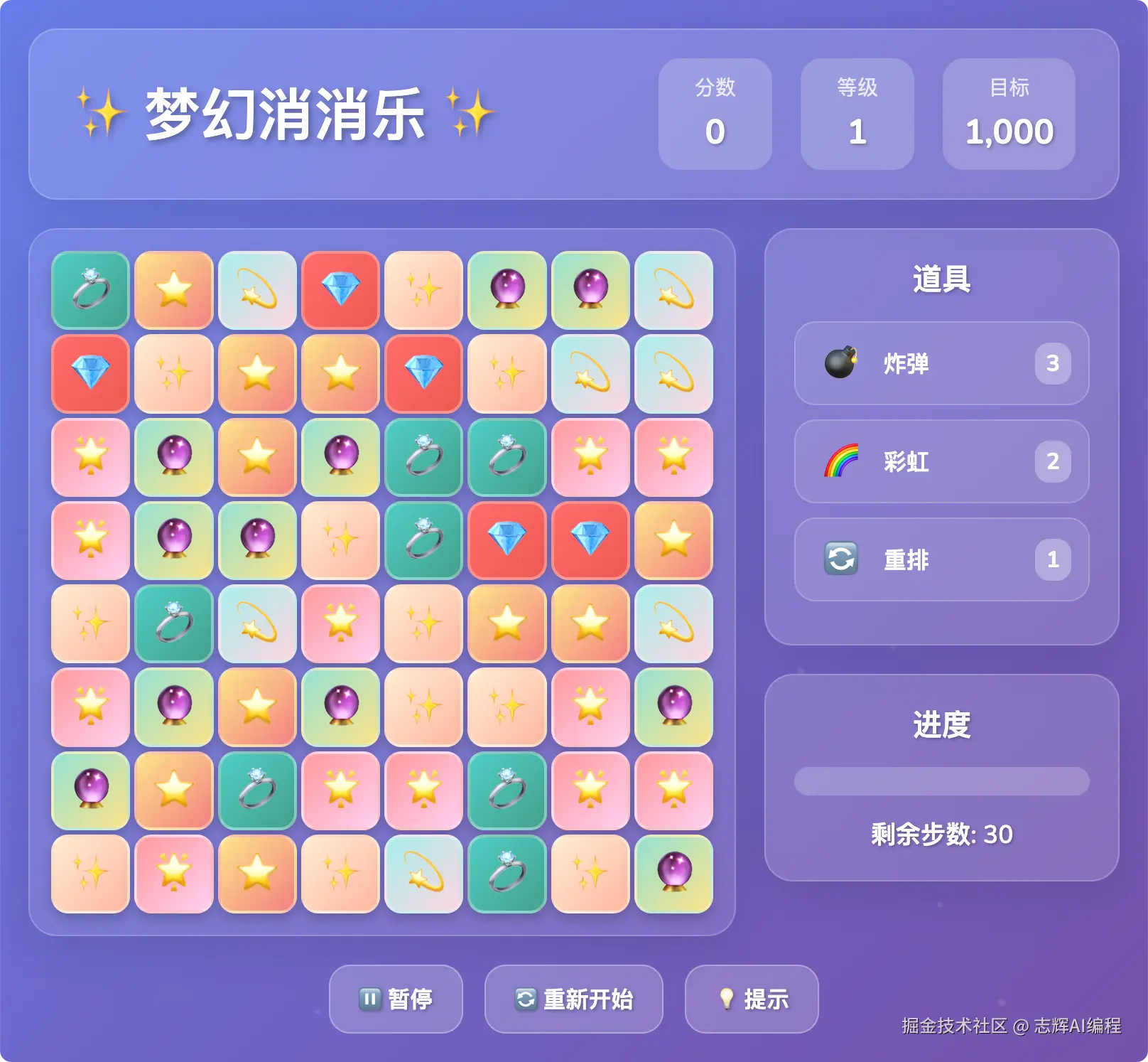 你是一个优秀的游戏设计师,设计一款漂亮美丽的消消乐,作为玩游戏的用户,确实玩了游戏后会很娱乐、很放松,发挥你的才智,设计这款游戏,加油!