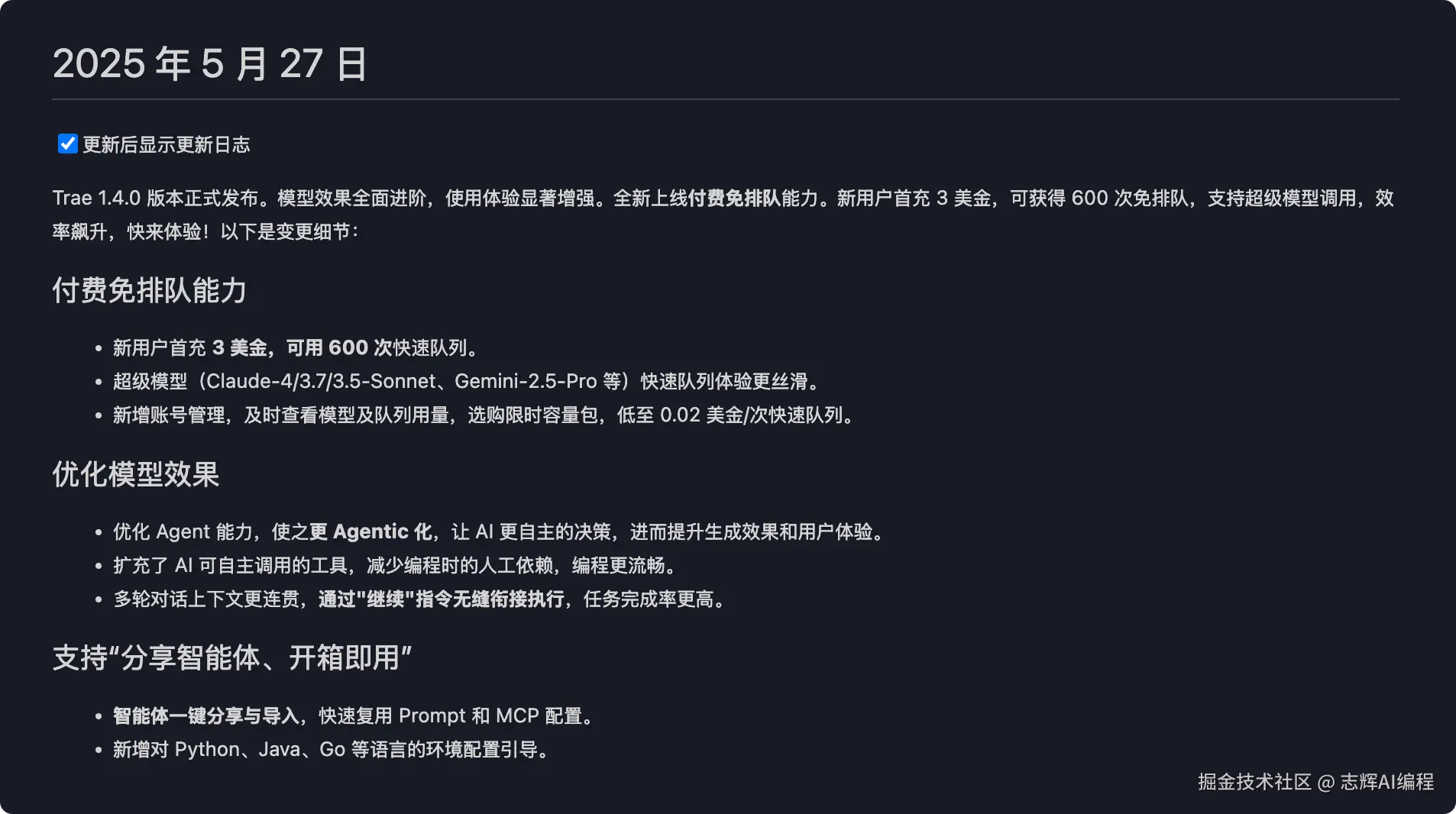 详细看下更新日志,除了带来 Pro 的特性外,还优化了 Agent 的能力,这个就得在实际的项目中来实战看看效果了。