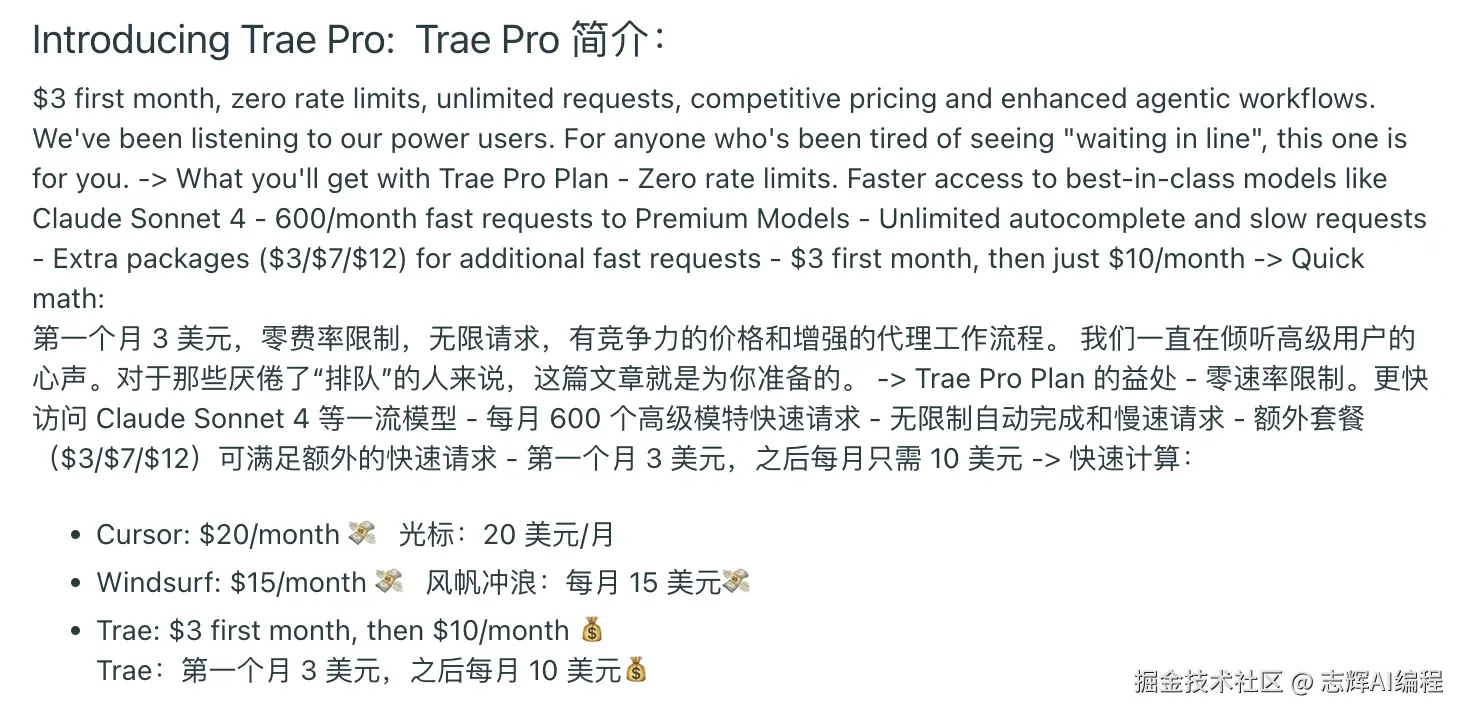总结来说,就是这次字节的 Trae 推出 Pro 的价格体系,真的是把价格打下来了