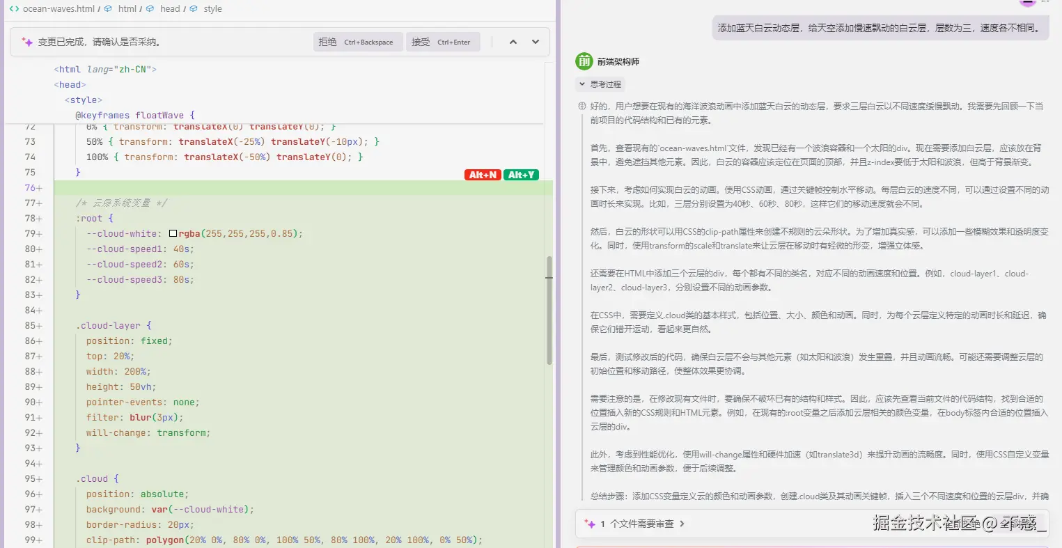 Trae 会自动创建带透明度渐变的云朵图层,并设定不同的运动速率,形成远近层次分明的“空间感”。