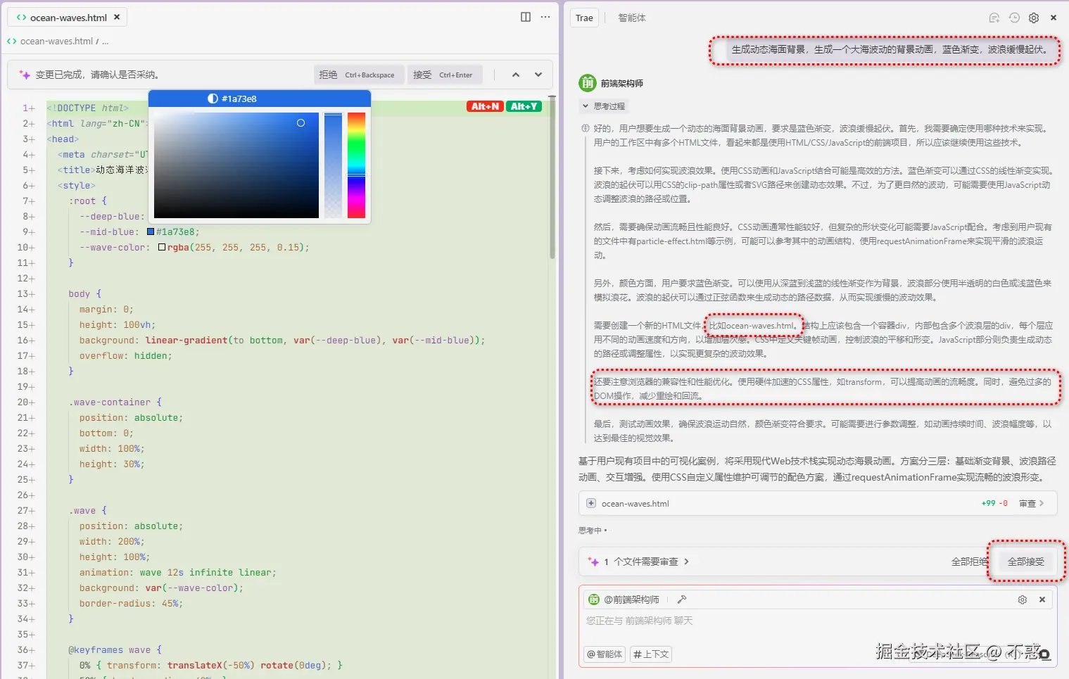 Trae 会自动为你生成底层海面动画,包括动态波纹、渐变海蓝色等视觉效果,默认响应式布局,适配所有设备。