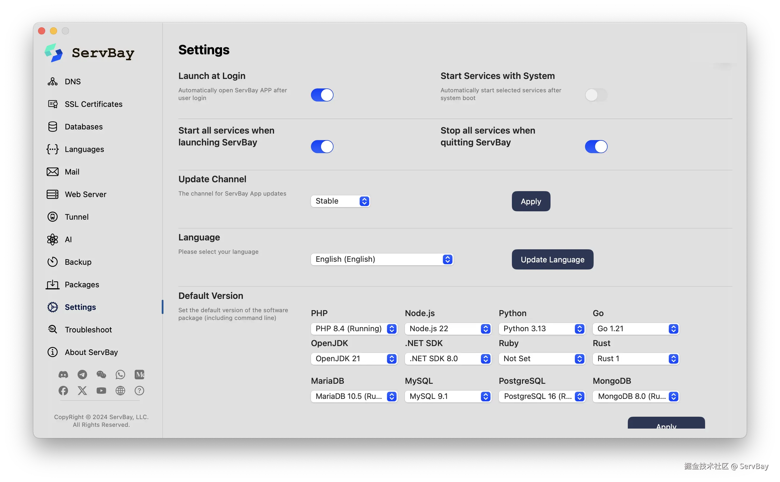 - 服务启动和停止选项: 在『设置』中新增了“启动 ServBay 时启动所有服务”和“退出 ServBay 时停止所有服务”的选项。您可以根据自己的工作习惯,灵活配置服务的启动与停止行为,节省手动操作时间。