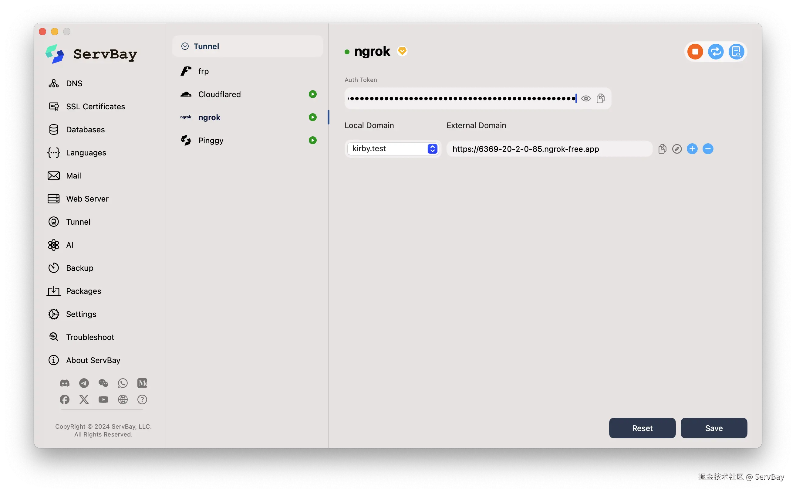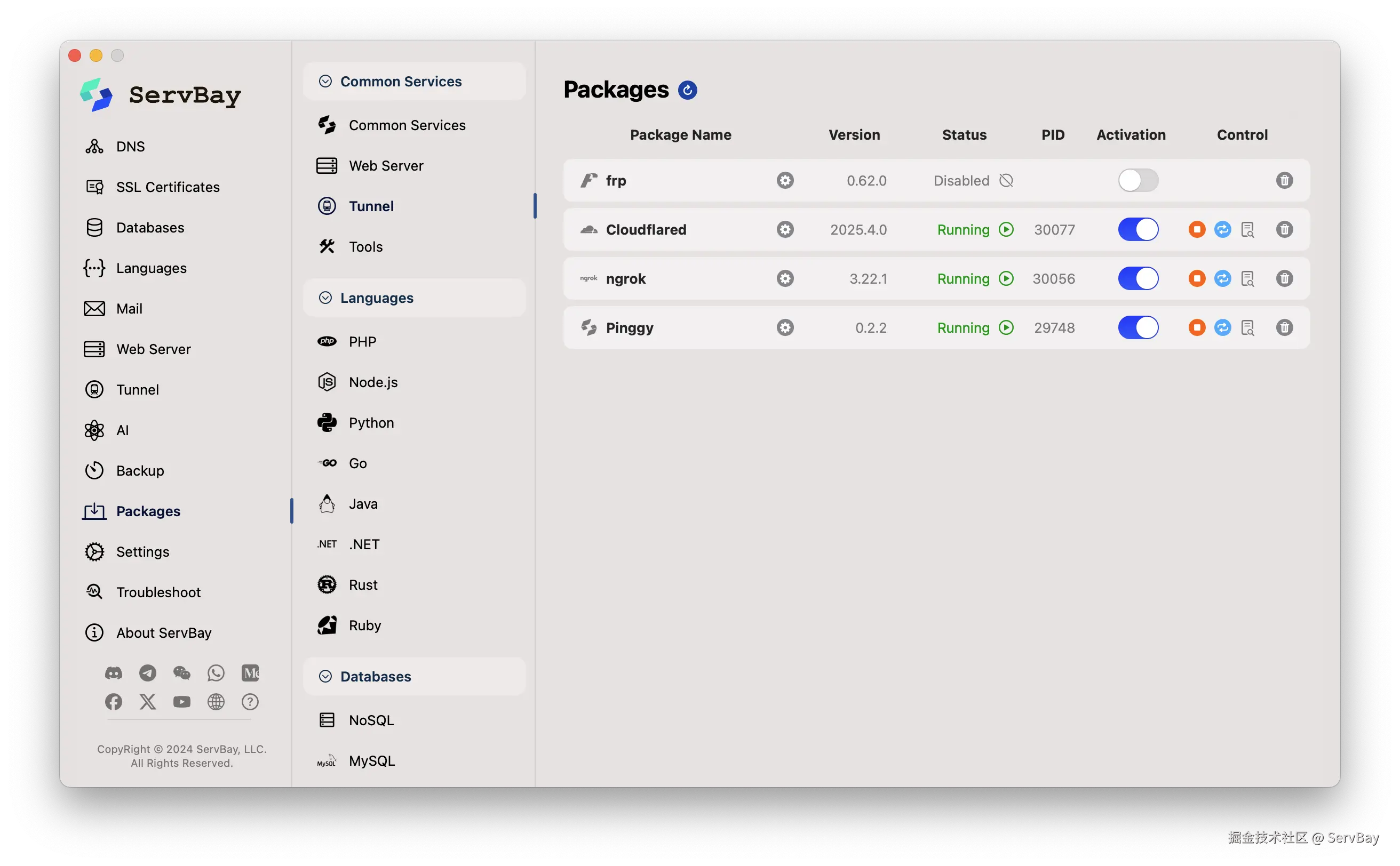 为了方便开发者将本地开发的服务安全便捷地暴露到公网进行测试、演示或协作,ServBay 1.13.0 集成了多款流行的第三方内网穿透工具: