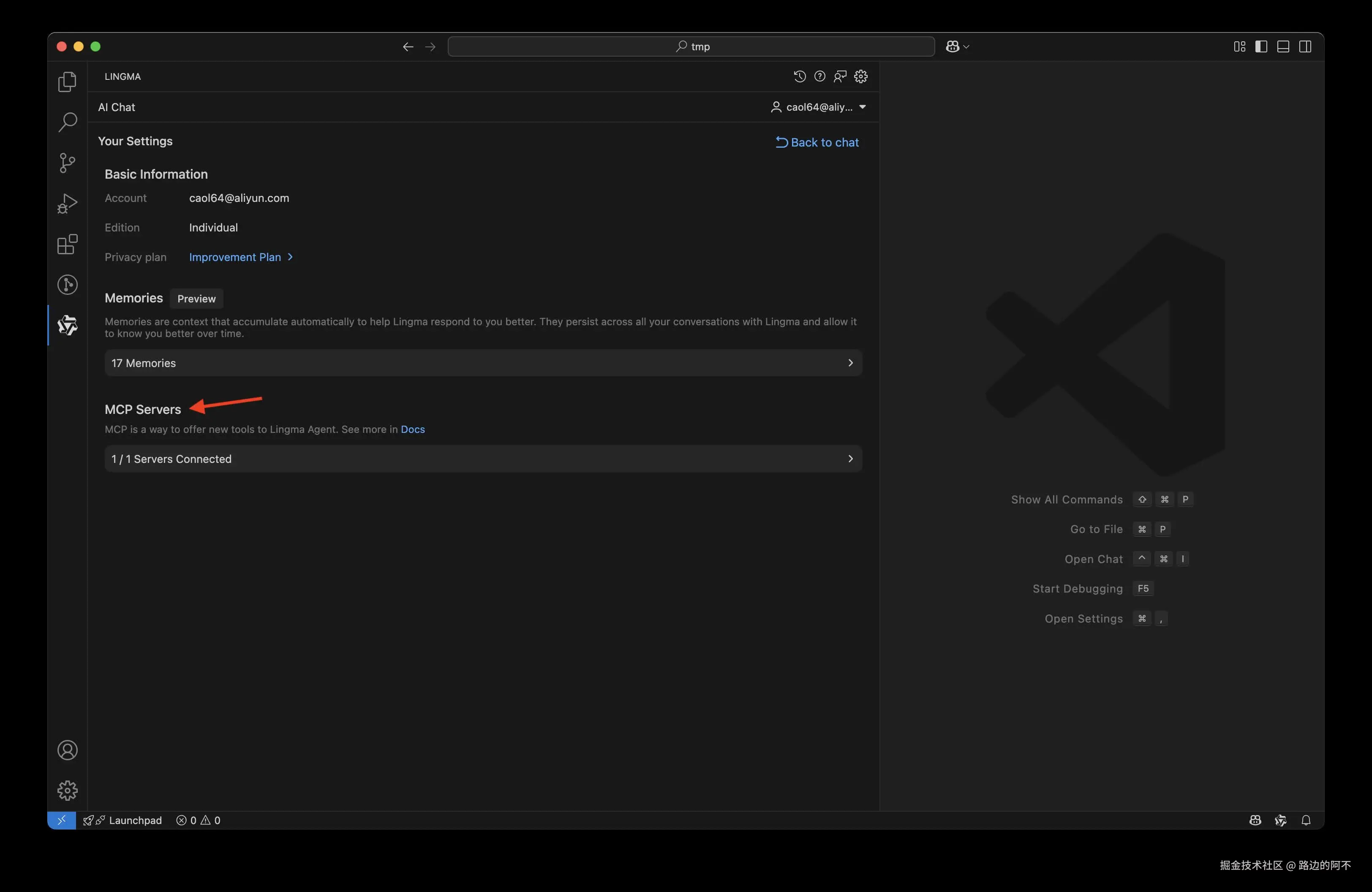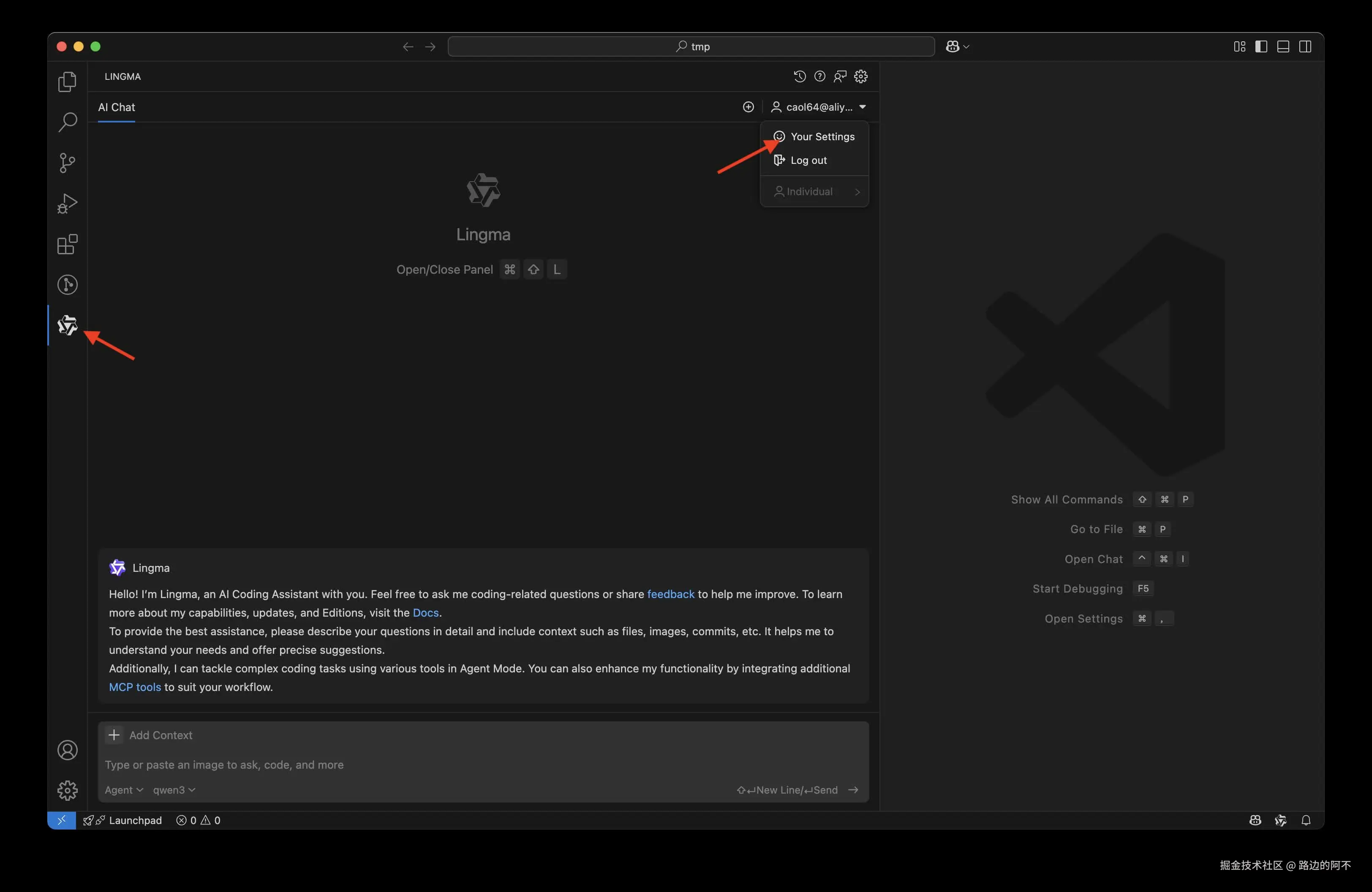 点击左侧“灵码”面板,在你的账号下拉框出点击Your settings。(注意你可能需要先注册一个灵码账号)