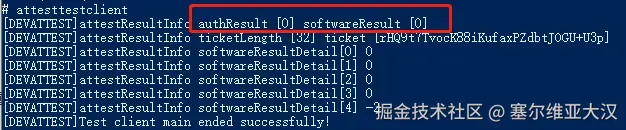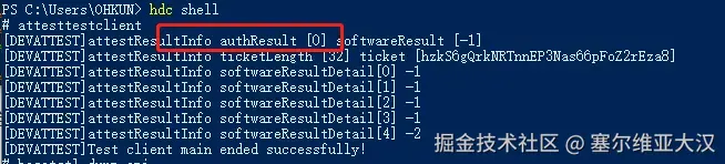等待设备重启,hdc shell进入设备控制台,执行attesttestclient,看到 authResult [0]、 softwareResult [0]说明验证通过。