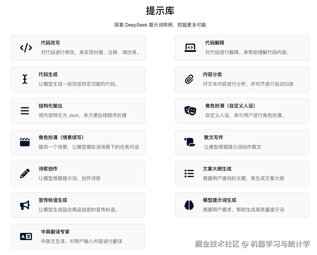 比如看 DeepSeek 的官方提示词库,都很简洁