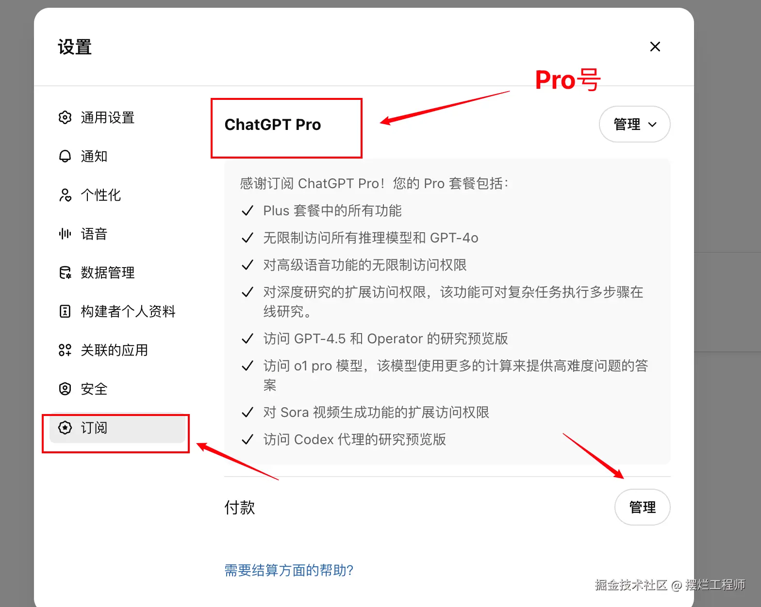 但是,你会发现找不到订阅管理的入口,我查了一下官方,和对比了ChatGPT Pro 和 ChatGPT Plus 账号之后。