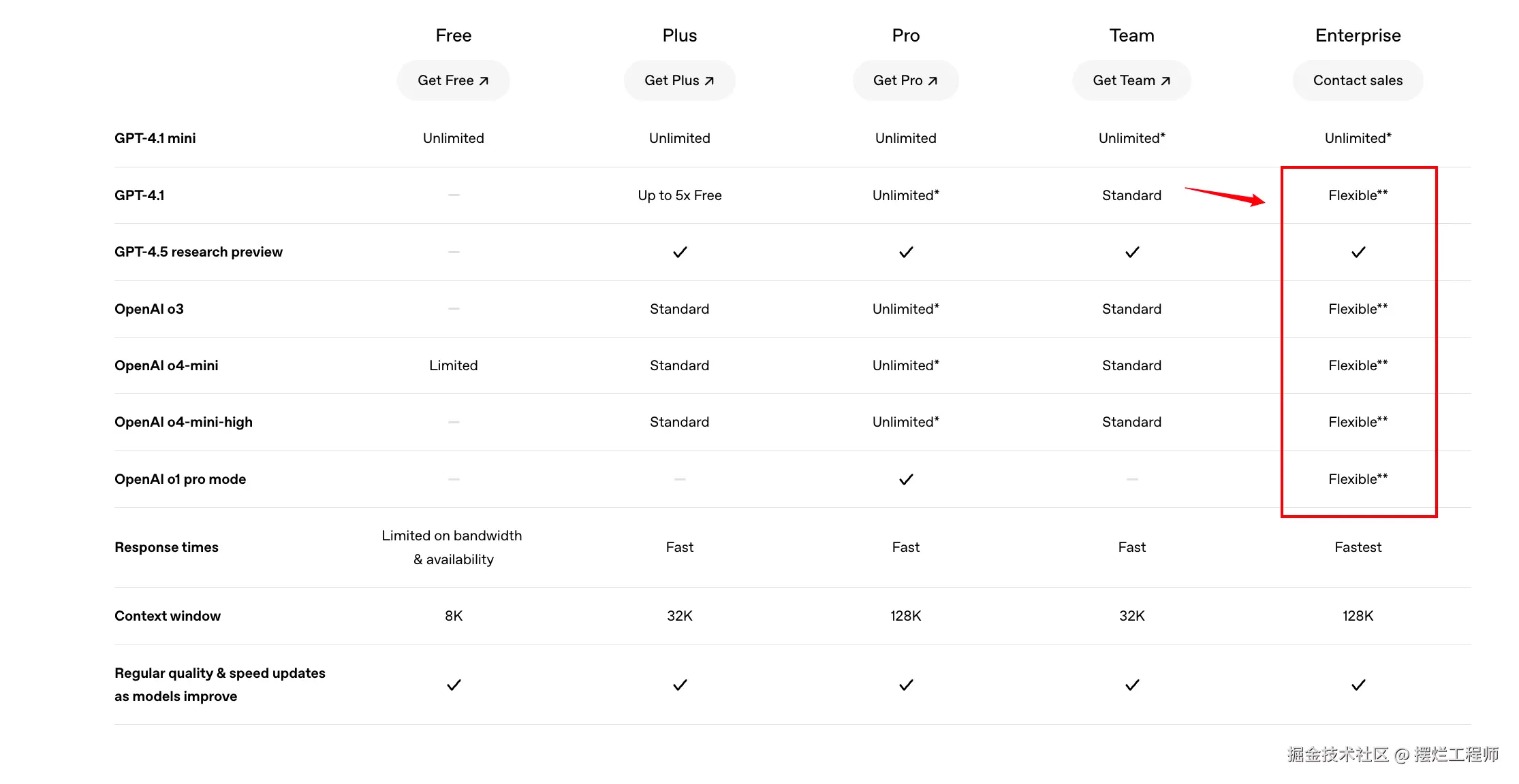 下面是最新的企业版本的弹性计划的积分消耗情况,ChatGPT灵活的定价方案表,目前只适用于企业计划: