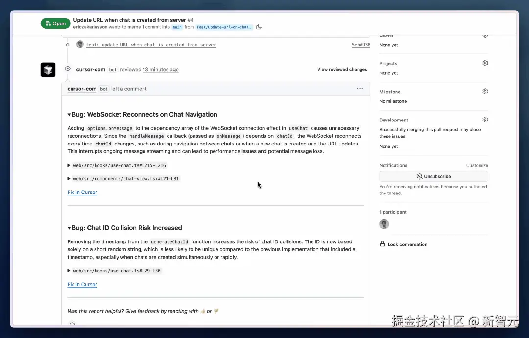 发现问题后,BugBot 会在 GitHub 的 PR 上留言。