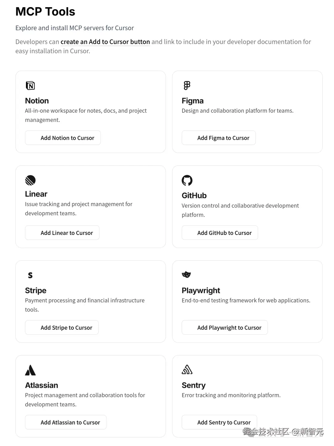 Cursor 整理了一份官方的 MCP 服务器列表,可在页面中将其添加到 Cursor。