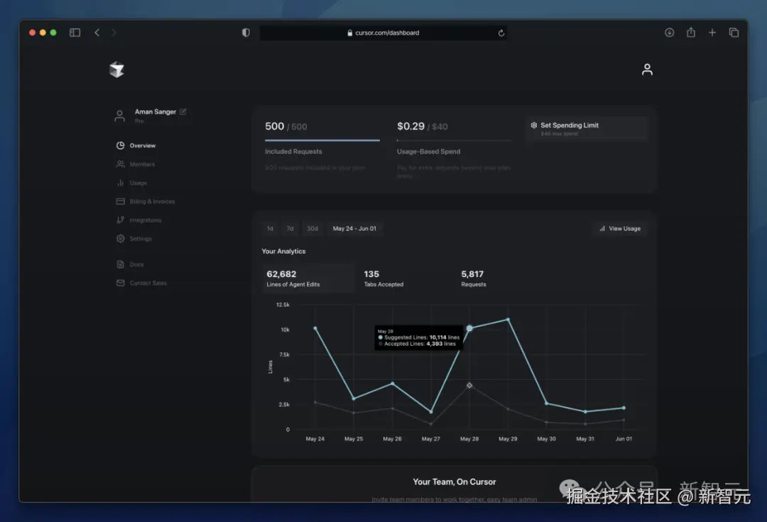 新仪表盘可以查看个人或团队的使用数据,更新显示名称,并查看按工具或模型分类的详细统计信息。例如编辑的代码行数、接受的标签数及请求数等。