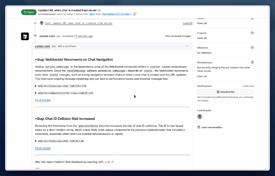 发现问题后,BugBot 会在 GitHub 的 PR 上留言。