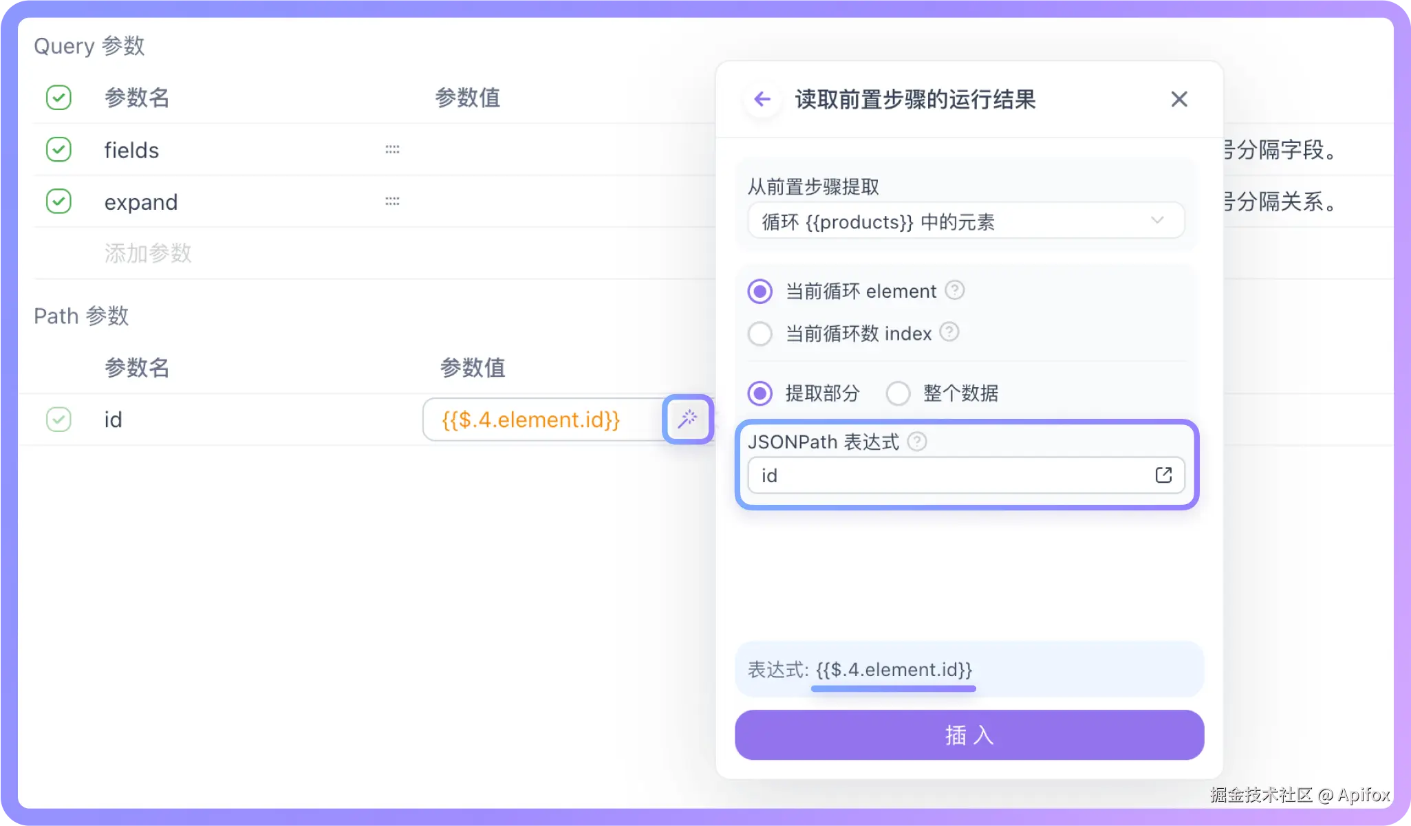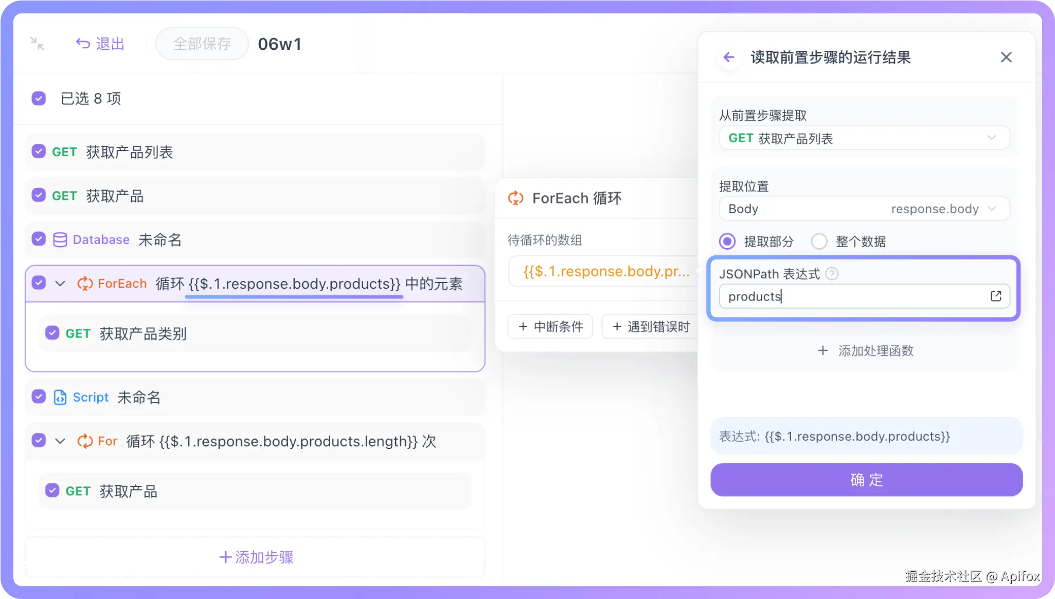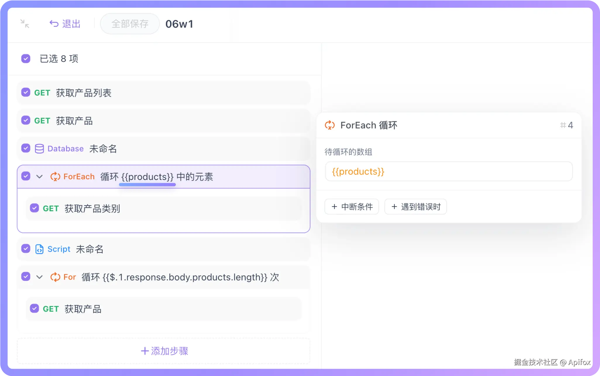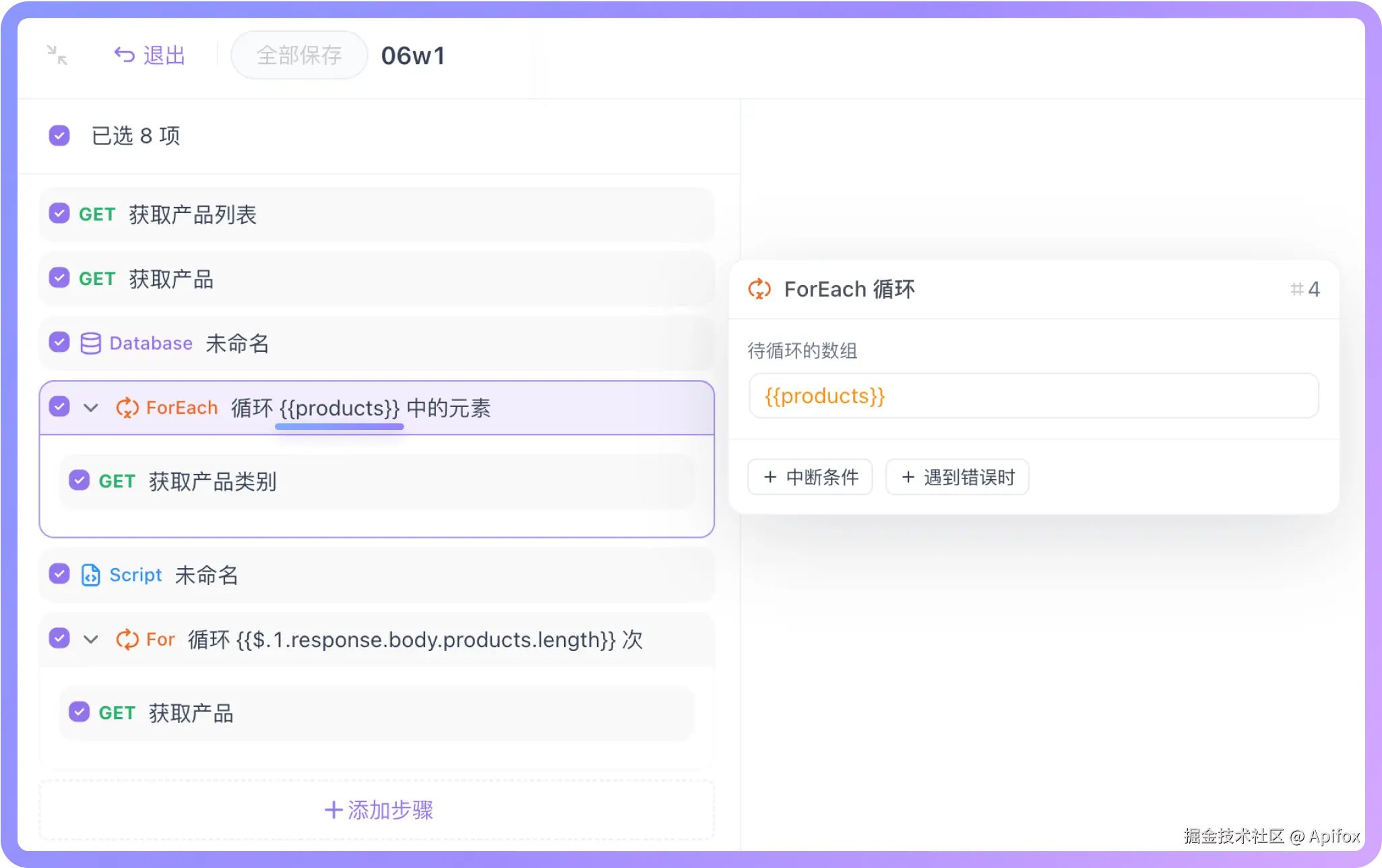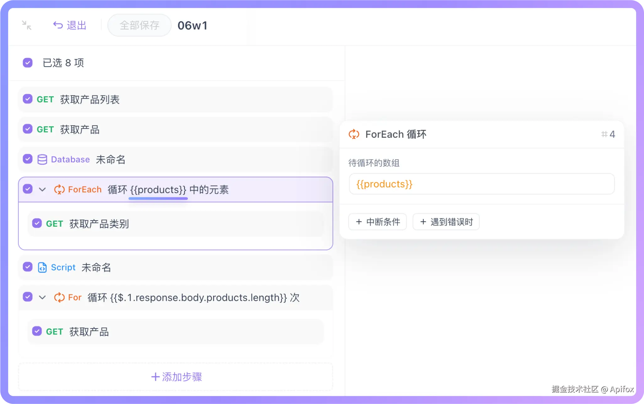 ForEach 循环非常适合批量处理数据,例如对数组中的每个元素发起一个请求。在不同轮次中,相同的请求模板会自动使用不同的数据,例如{{$.4.element.id}}: