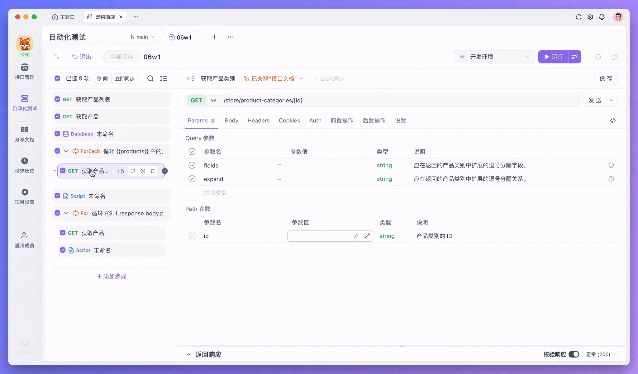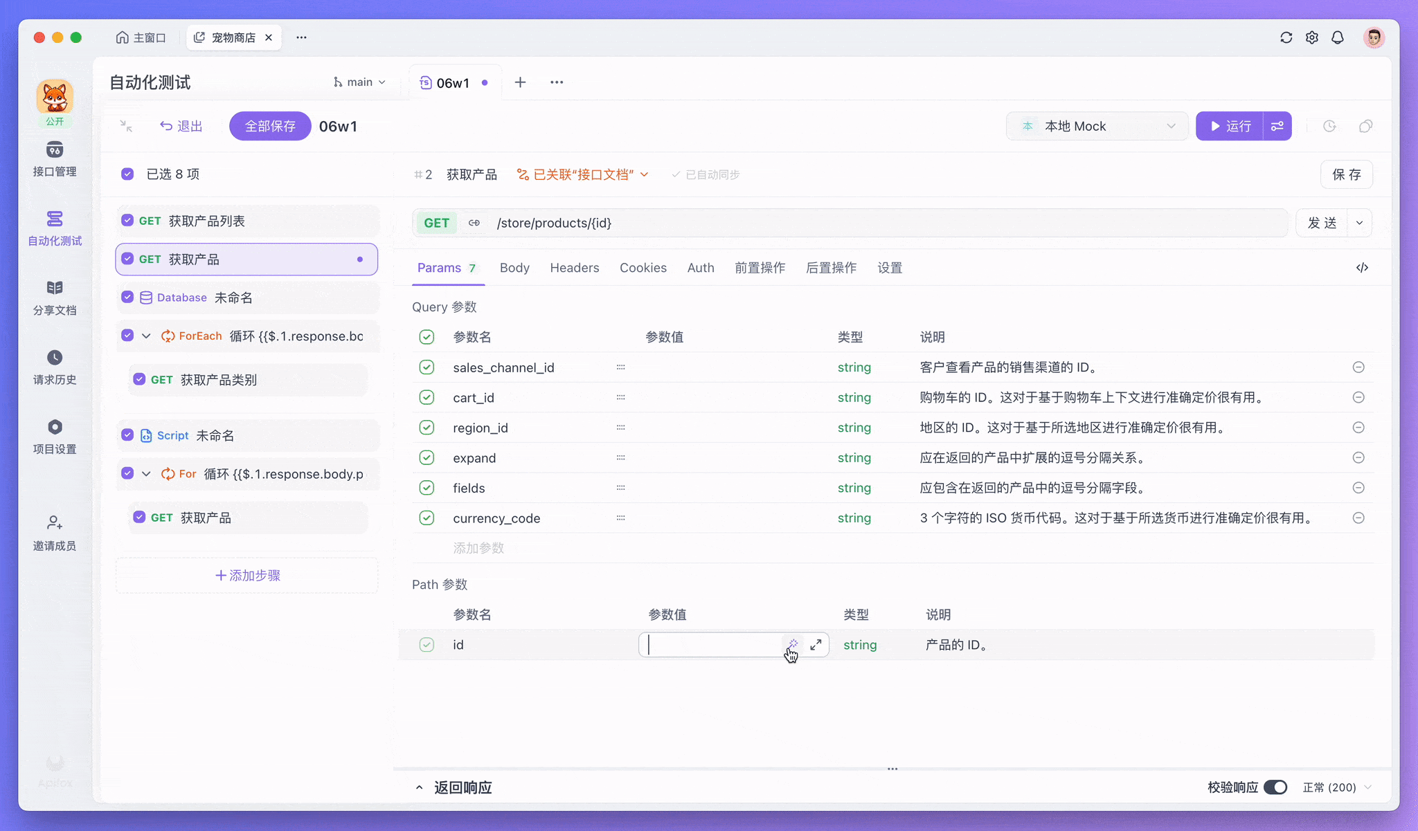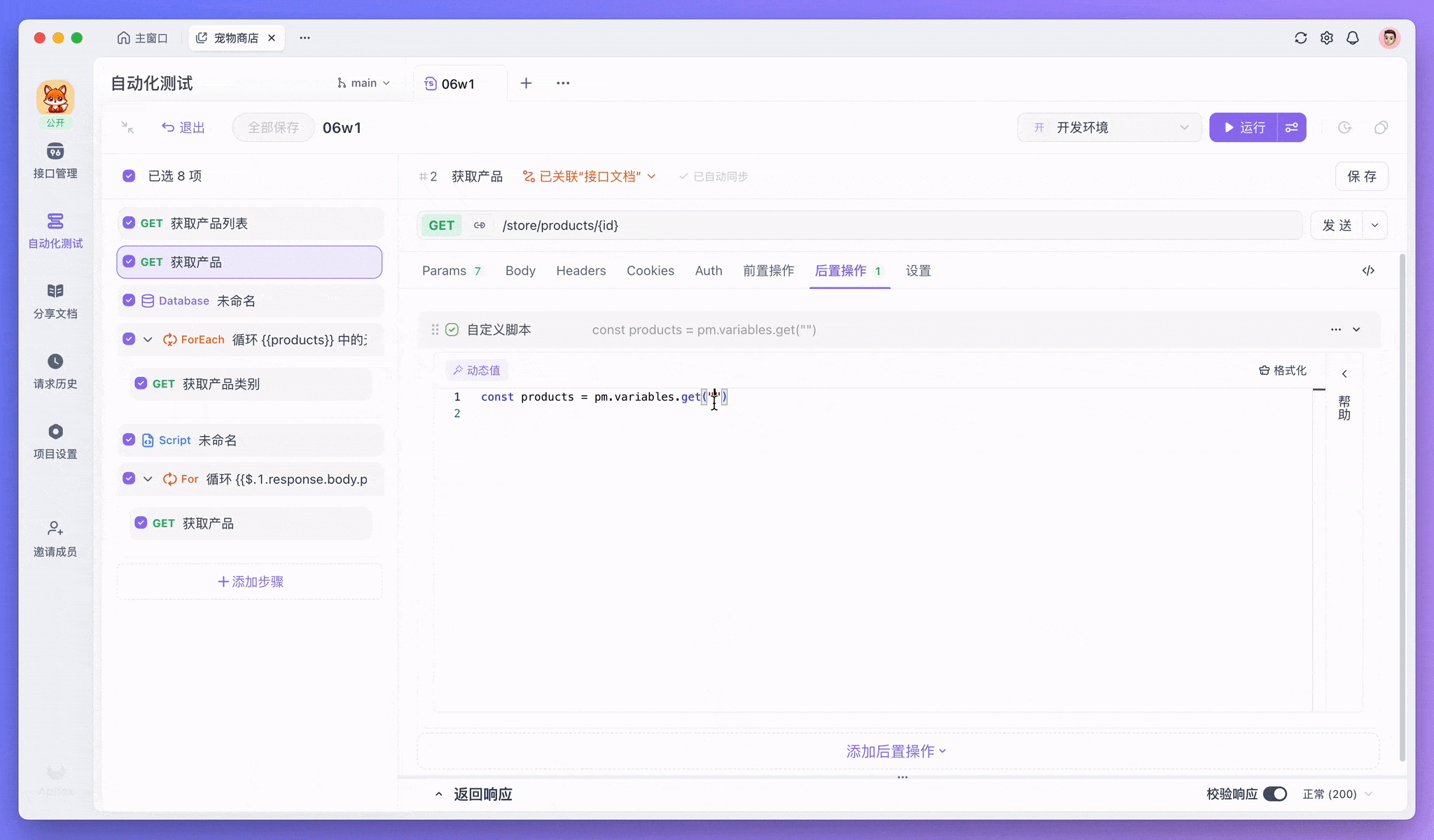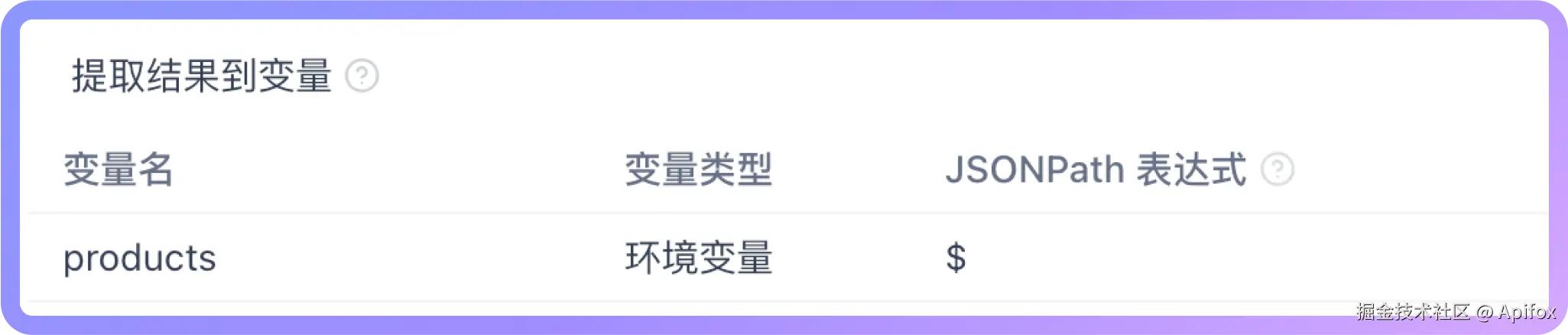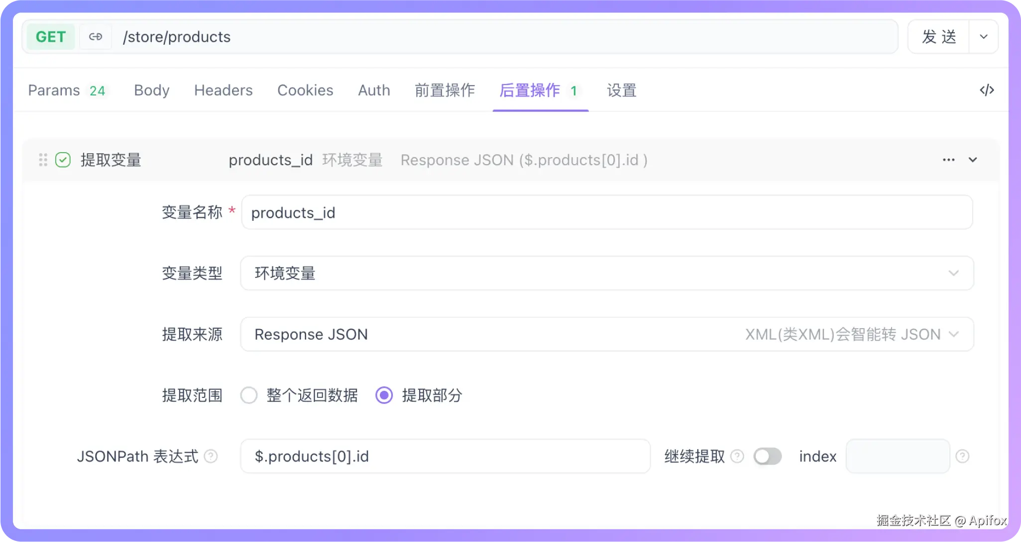 你也可以在接口步骤中通过“提取变量”功能,将响应中的特定字段提取为变量。例如设置变量名称为 products_id,JSONPath 为 $.products[0].id,那么在后续步骤中就可以直接使用 {{products_id}} 来引用这个值。