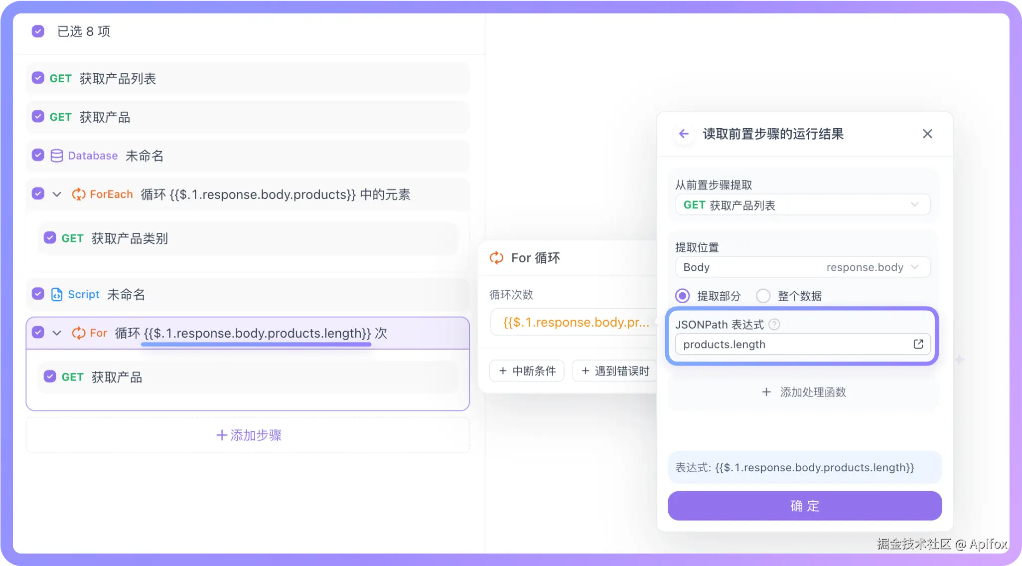 若需根据接口返回数组的长度执行多轮循环,可以通过动态值读取数组的 .length 值作为循环次数,例如{{$.1.response.body.products.length}}: