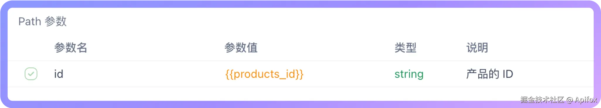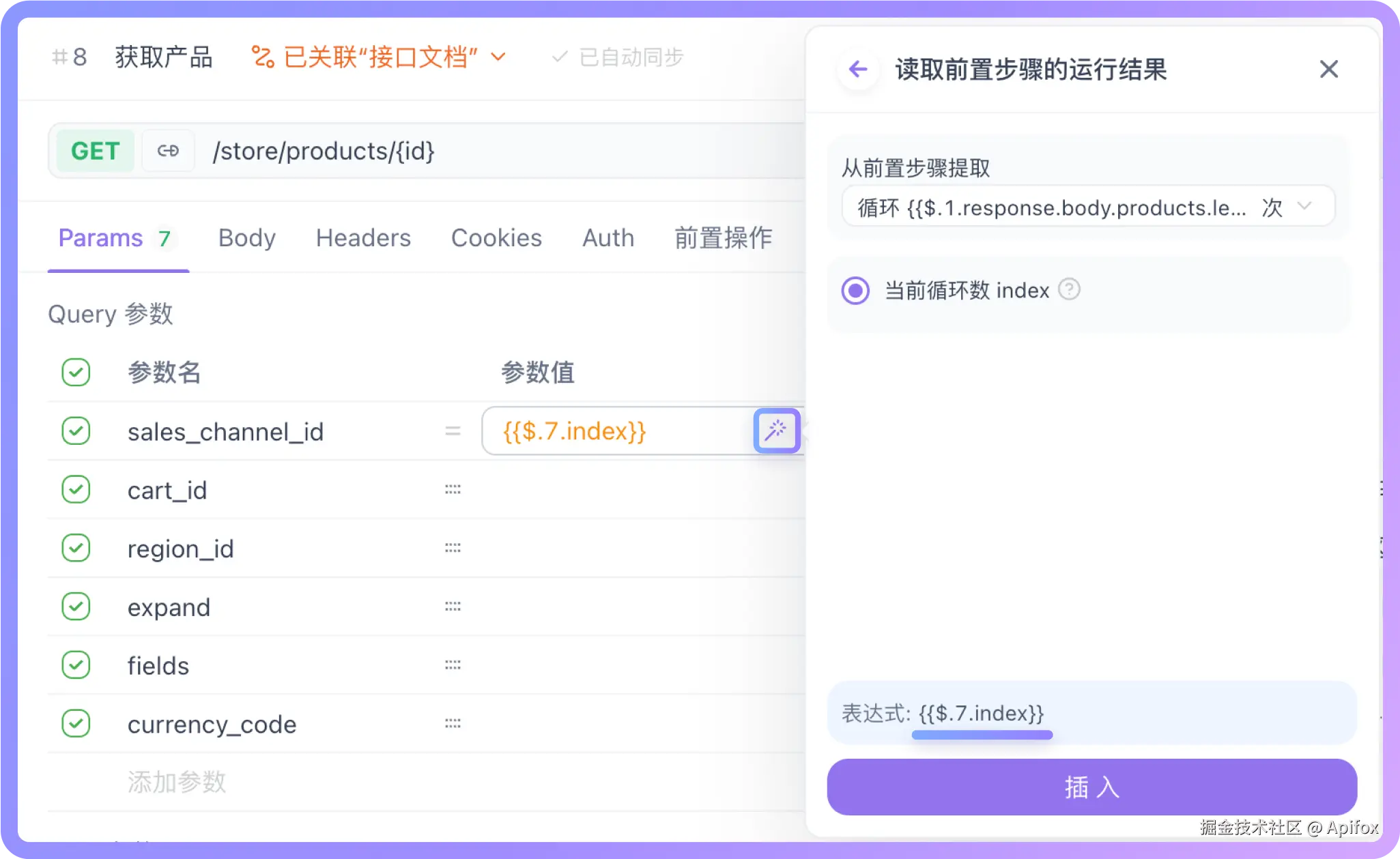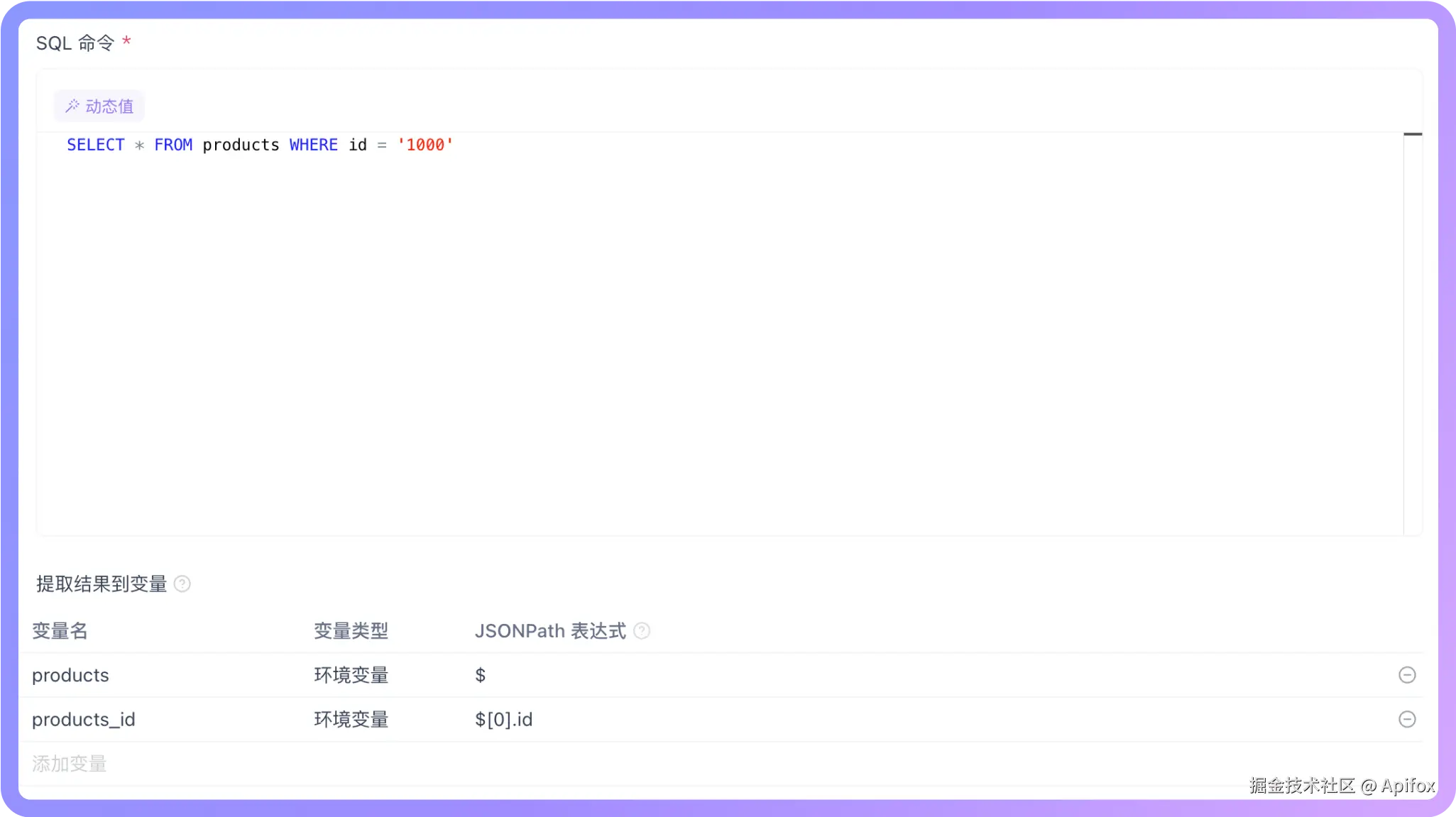 如果你在数据库中查询出了某个 id,将其提取为products_id的变量后,下游接口的请求参数中可以直接通过{{products_id}}引入该变量: