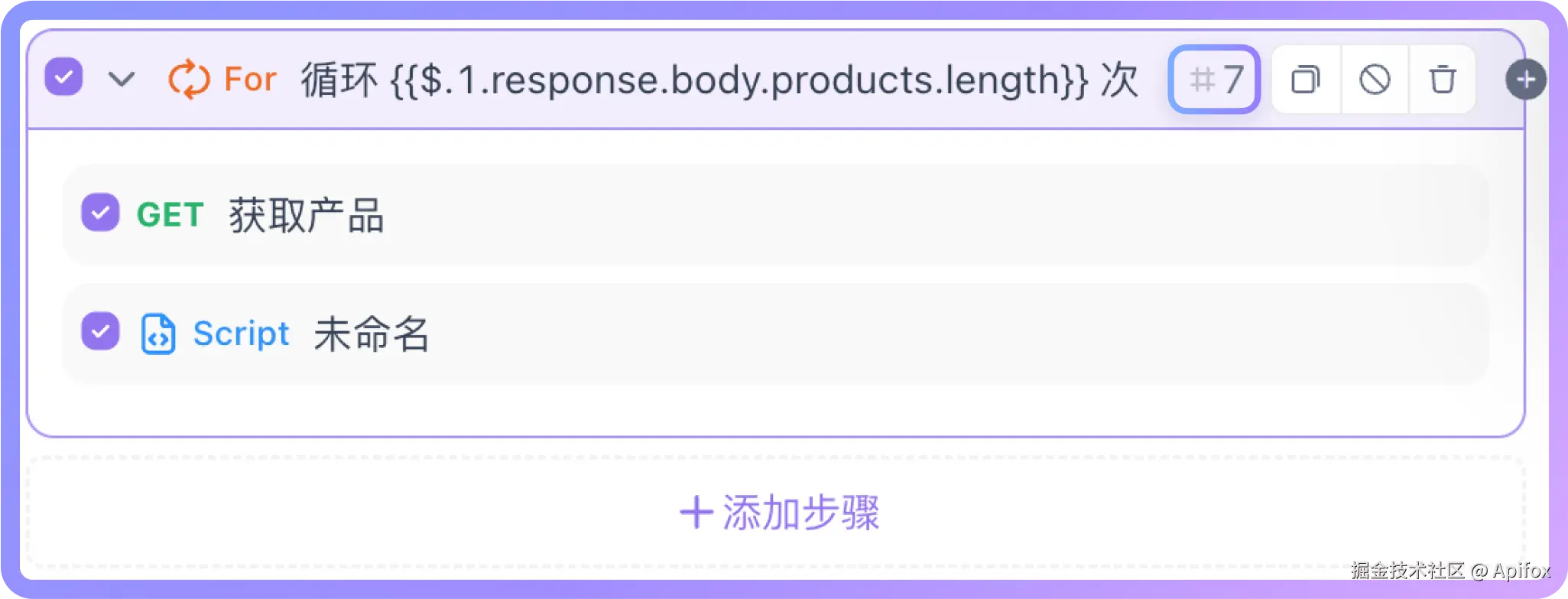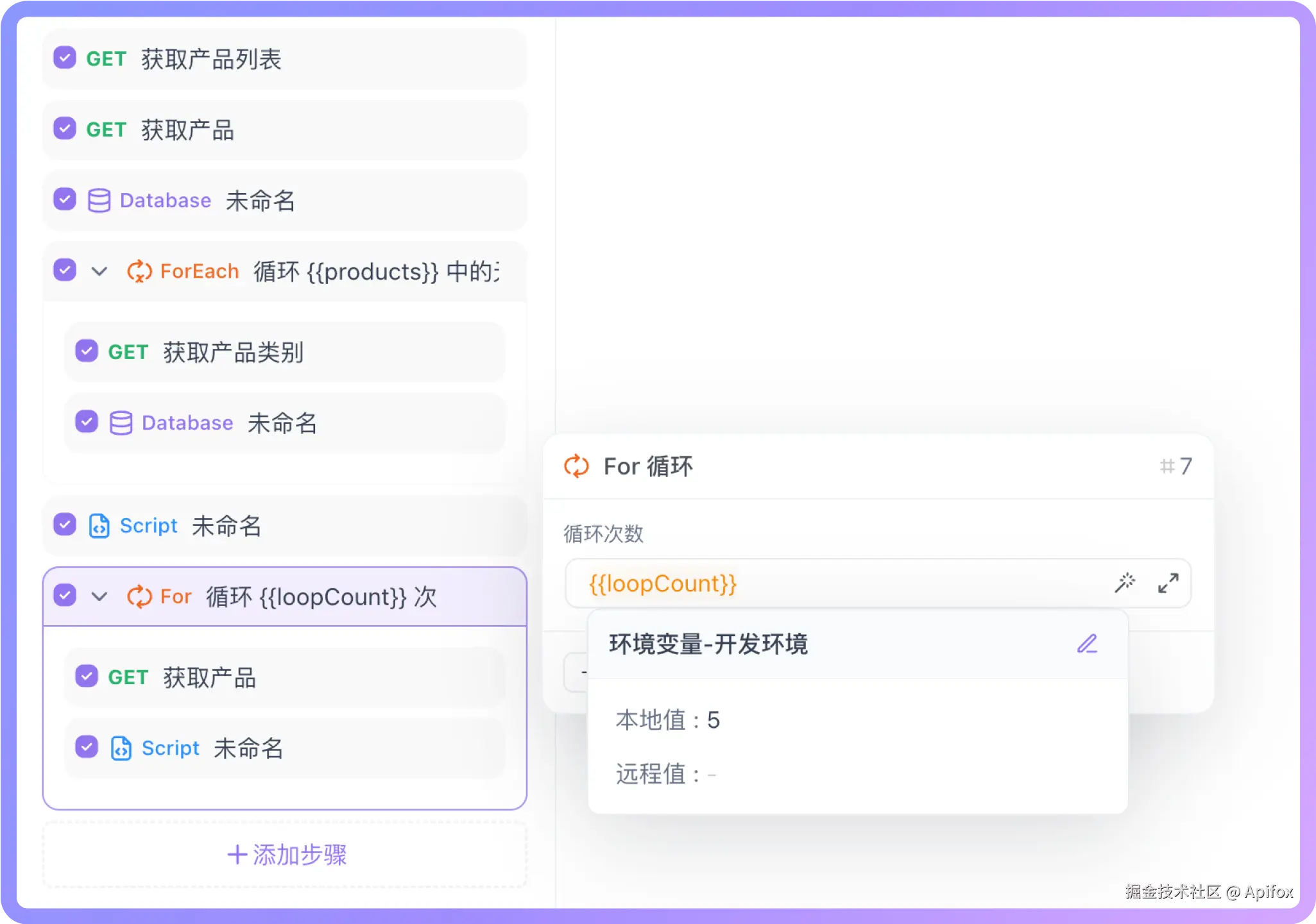 在使用 Apifox 编排自动化测试流程时,我们会接触到各种类型的测试步骤:接口请求、数据库查询、For 循环、ForEach 遍历、脚本处理等等。