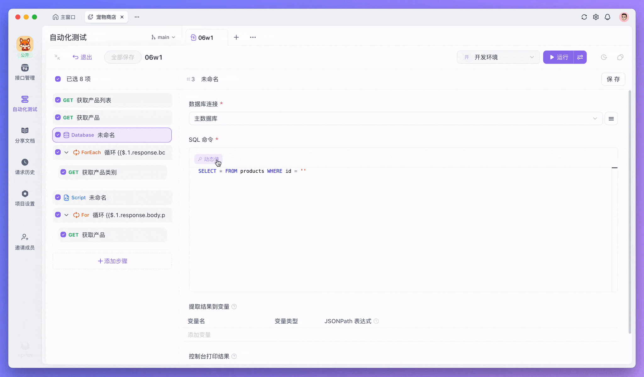 举个例子:你可能需要在前置步骤中获取用户 token,或查询数据库中的某条记录,然后将这些结果用于下一个测试步骤的调用。