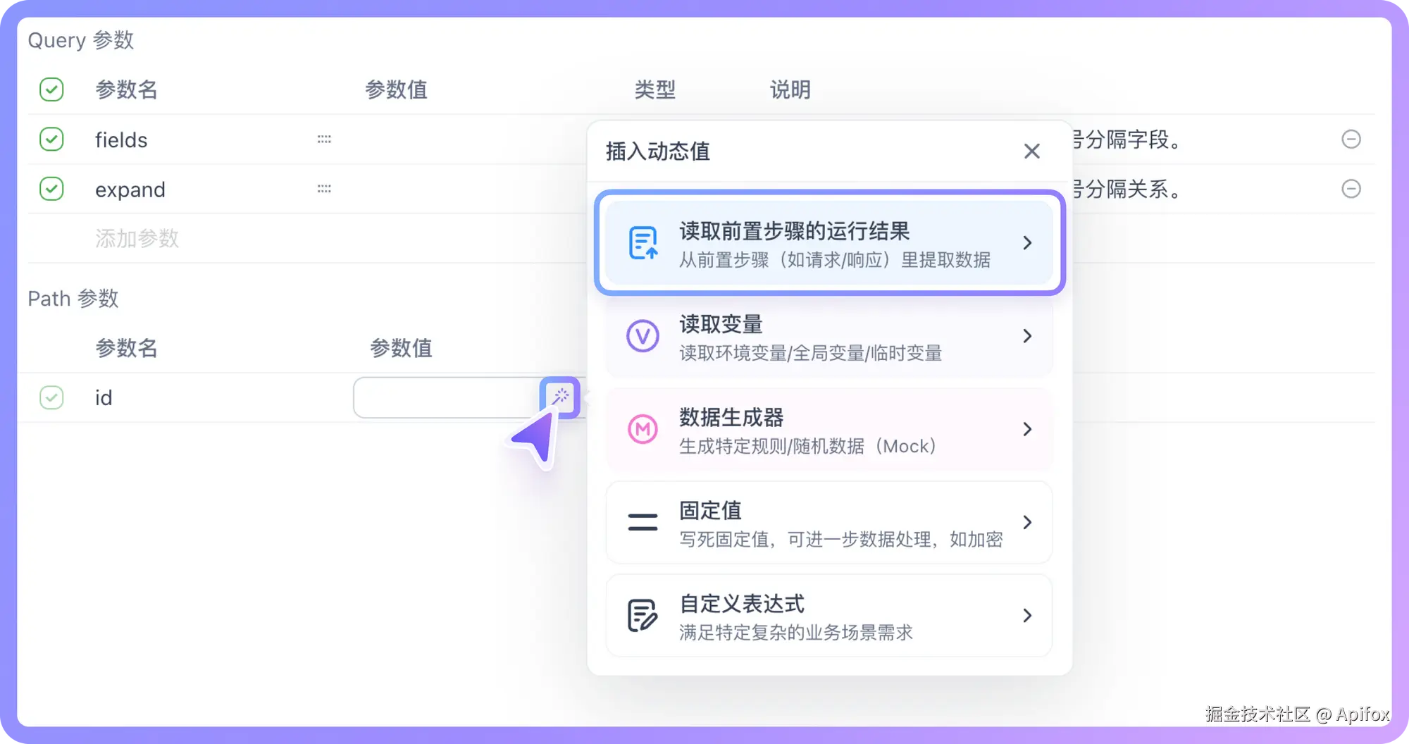你可以在下游步骤中,通过“动态值”语法直接引用前置接口的响应。在任意输入框中点击“魔棒”图标,选择「读取前置步骤的运行结果」,Apifox 会自动生成表达式,无需手动拼写。