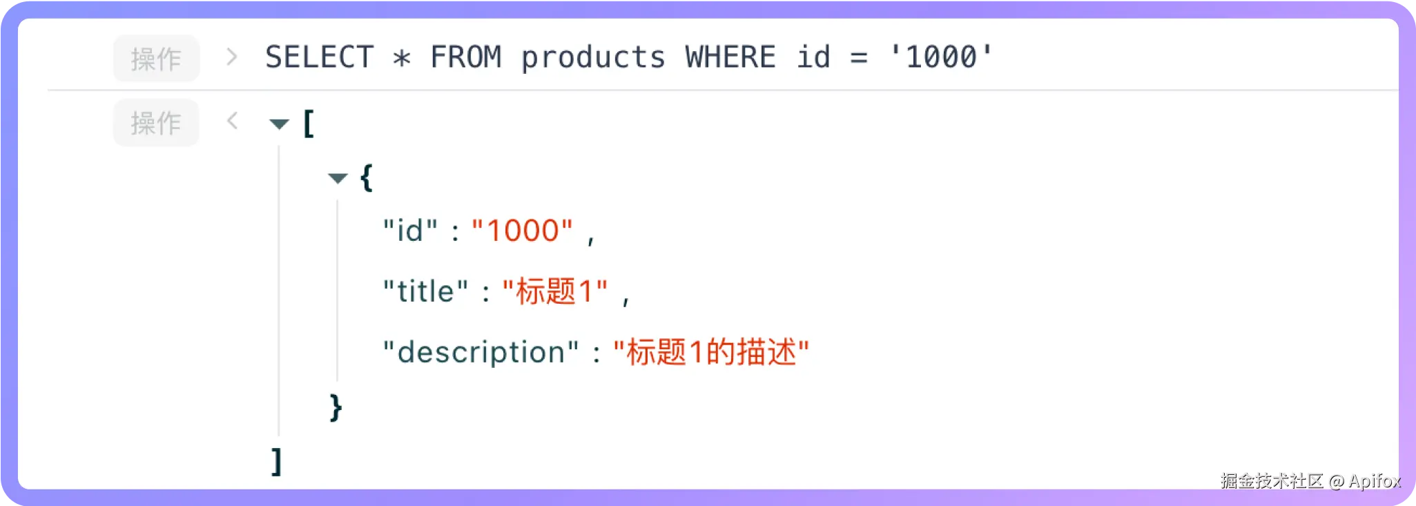 在数据库步骤中执行完 SQL 后,Apifox 会自动解析出结构化响应,格式大致如下: