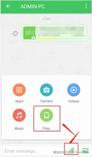 步骤3: 点击“ Paperclip ”>“文件”,从Android设备中选择视频。然后将它们发送到电脑。片刻之后,您将在电脑上收到视频。