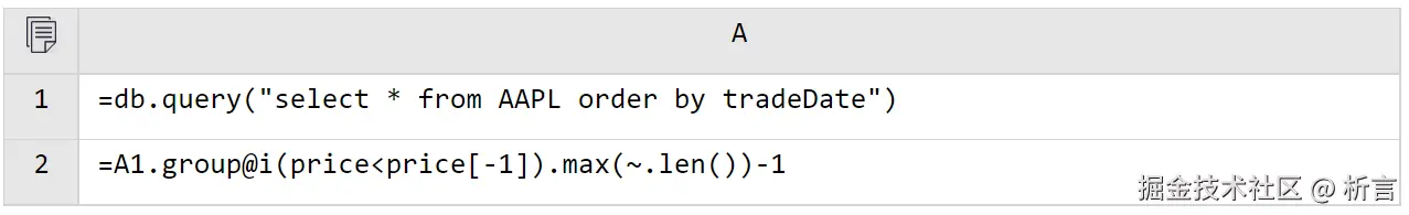 在敏捷语法与过程计算的支持下,即使原来使用 SQL 难以完成的复杂计算(更不用说 Java 了),用 SPL 也可以轻松实现。比如要根据股票记录查询某只股票最长连续上涨天数,SQL(oracle)的写法如下: