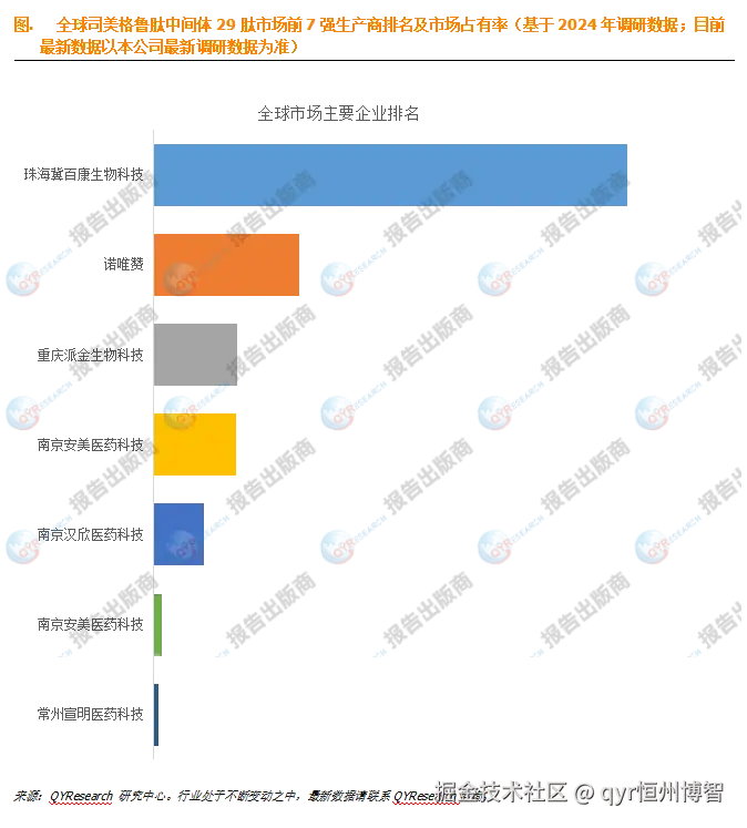 全球范围内,司美格鲁肽中间体29肽主要生产商包括珠海冀百康生物科技,诺唯赞,重庆派金生物科技,南京安美医药科技和南京汉欣医药科技等,其中前五大厂商占有大约88%的市场份额。