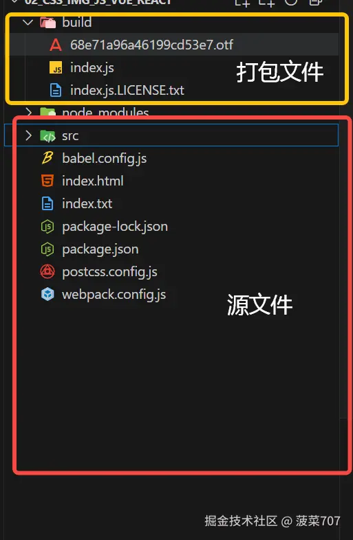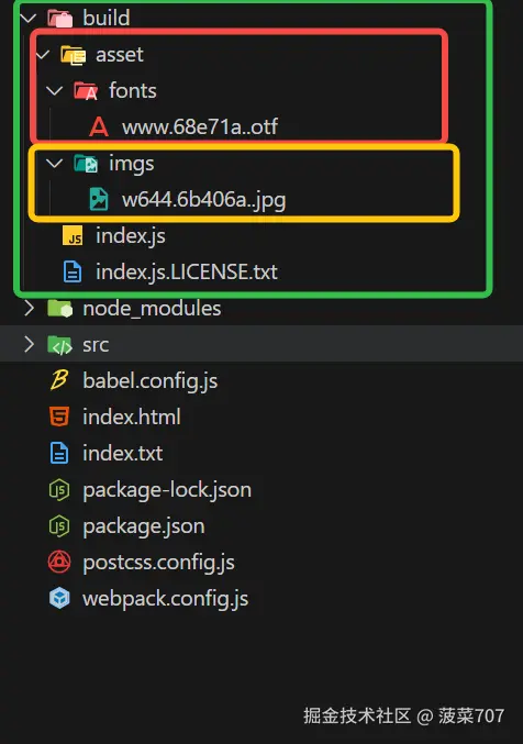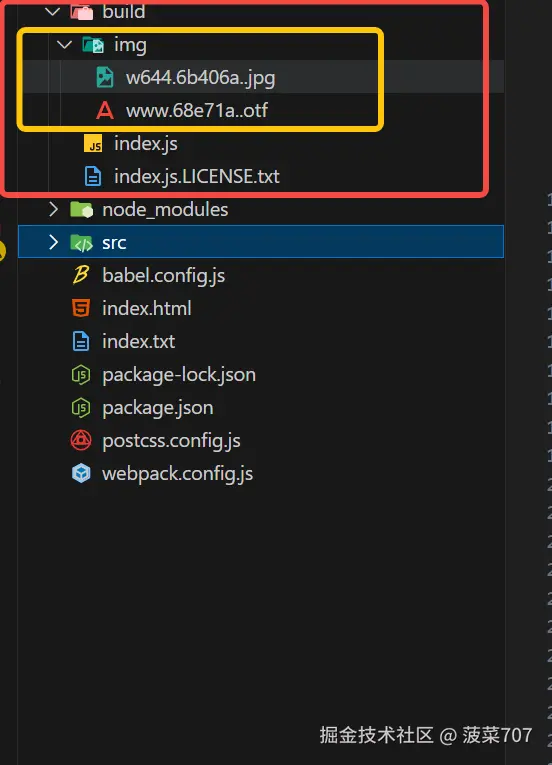 // ... 省略其他配置 module: { rules: [ // ... 省略其他配置 { test: /.(jpg|png|gif|jpe?g|svg)$/, type: 'asset/resource', }, ], },- 如图我们会有一个疑问,我只配置了一个图片扩展名的配置 怎么字体文件,怎么也进入打包文件中呢?