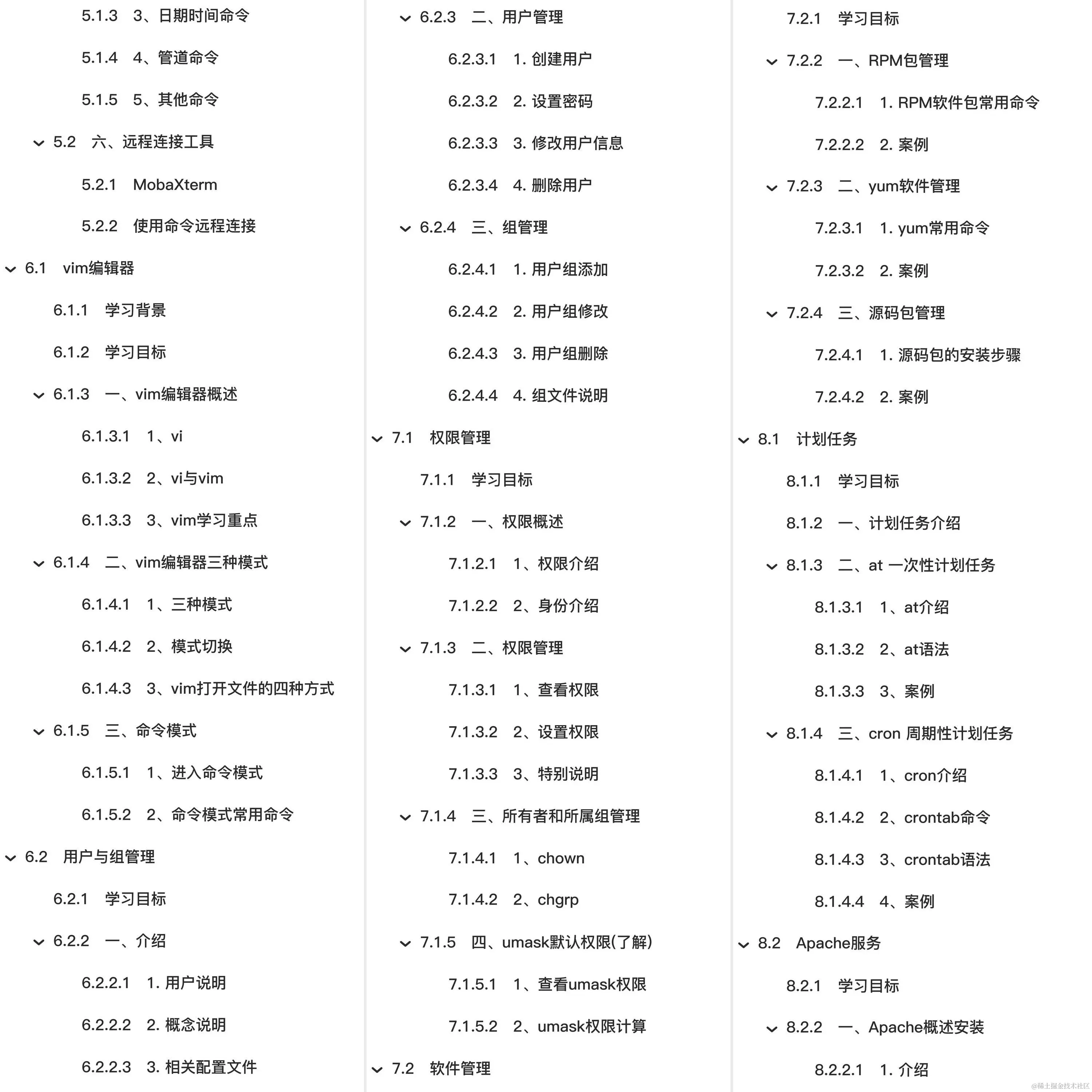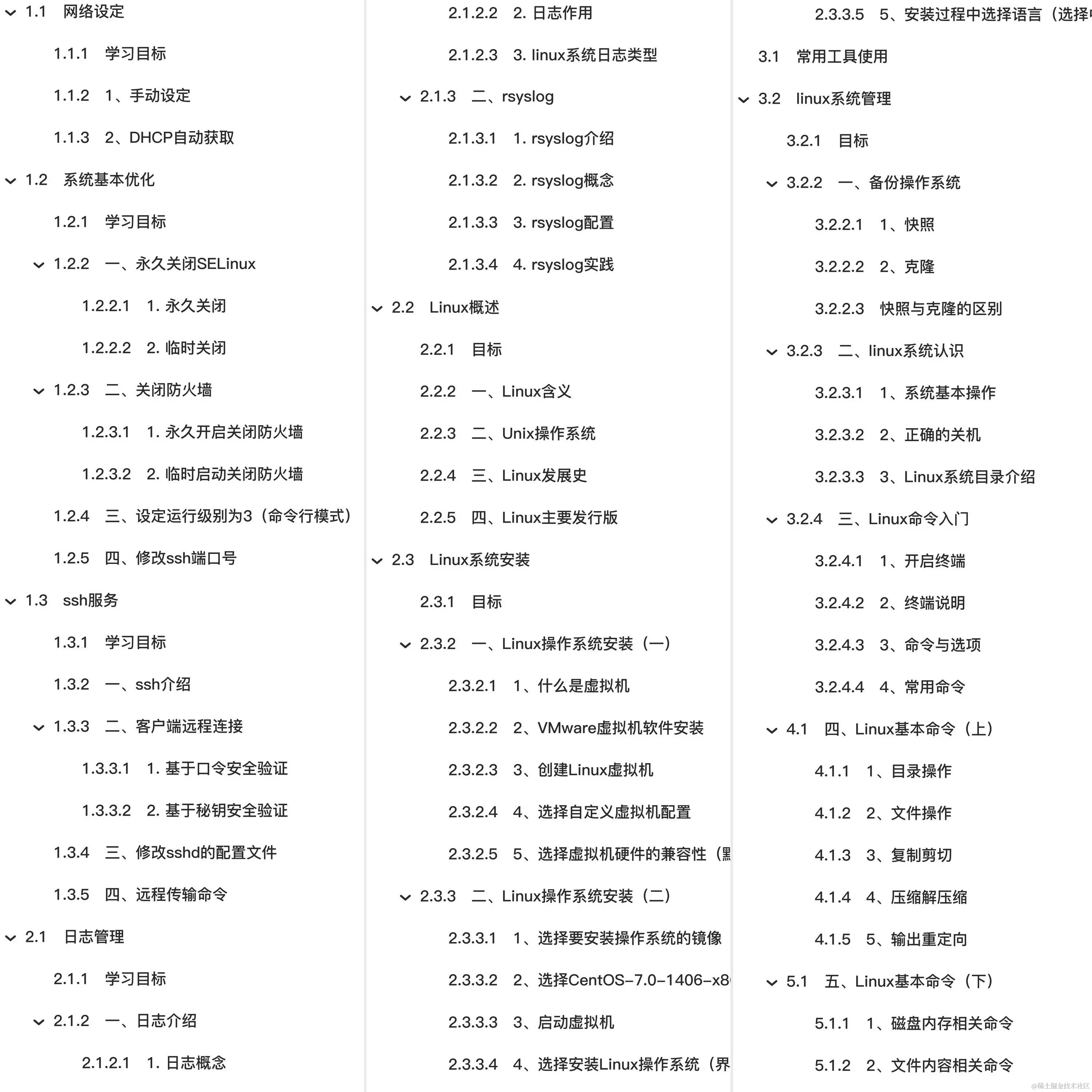 教程总体简介:网络设定 学习目标 1、手动设定 2、DHCP自动获取 系统基本优化 一、永久关闭SELinux 1. 永久关闭 二、关闭防火墙 2. 临时启动关闭防火墙 三、设定运行级别为3(命令行模式) 四、修改ssh端口号 ssh服务 一、ssh介绍 二、客户端远程连接 1. 基于口令安全验证 三、修改sshd的配置文件 四、远程传输命令 日志管理 二、rsyslog Linux概述 目标 二、Unix操作系统 三、Linux发展史 常用工具使用 linux系统管理 一、备份操作系统 1、快照 2、克隆 快照与克隆的区别 四、Linux基本命令(上) 1、目录操作 2、文件操作 3、复制剪切 4、压缩解压缩 5、输出重定向 6、查看文件内容 7、帮助 六、远程连接工具 MobaXterm 使用命令远程连接 vim编辑器 学习背景 二、vim编辑器三种模式 1、三种模式 2、模式切换 3、vim打开文件的四种方式 三、命令模式 2、命令模式常用命令 四、末行模式 五、编辑模式 六、实用功能 1、vim配置显示行号 2、异常退出 3、别名机制 七、vim案例 用户与组管理 二、用户管理 1. 创建用户 2. 设置密码 3. 修改用户信息 三、组管理 1. 用户组添加 4. 组文件说明 权限管理 一、权限概述 1、权限介绍 2、身份介绍 三、所有者和所属组管理 1、chown 2、chgrp 四、umask默认权限(了解) 1、查看umask权限 软件管理 一、RPM包管理 1. RPM软件包常用命令 2. 案例 二、yum软件管理 计划任务 一、计划任务介绍 二、at 一次性计划任务 2、at语法 3、案例 三、cron 周期性计划任务 1、cron介绍 2、crontab命令 Apache服务 一、Apache概述安装 1. 介绍 3. 快速入门 4.apache基本概念 二、apache配置详解及实践 1、配置文件说明 2、配置项详解 三、虚拟主机配置 1、基于ip 四、rewrite重写 五、apache日志切割 1、为什么要进行日志切割 2、日志分割两种方式