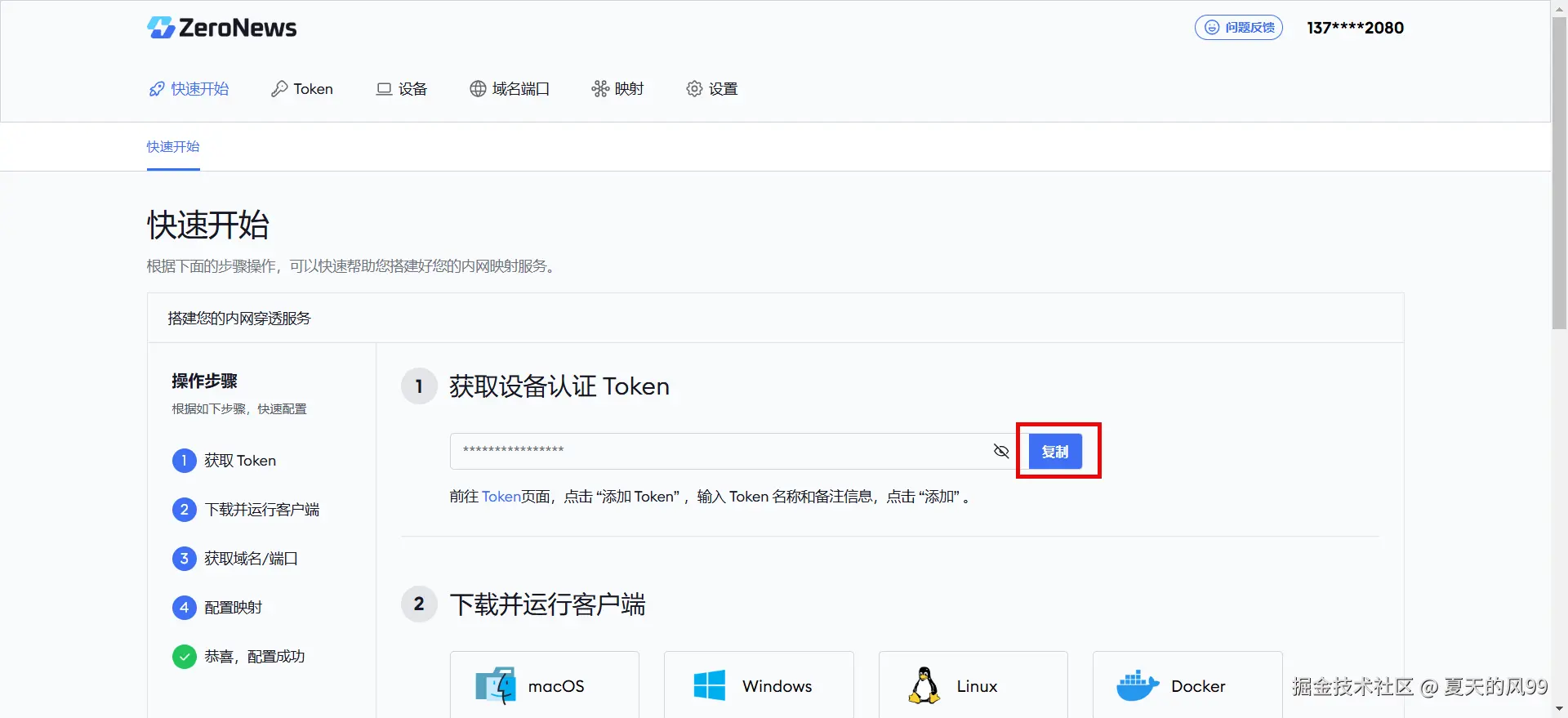 平台,在"快速开始"页面中复制一个Token备用。
