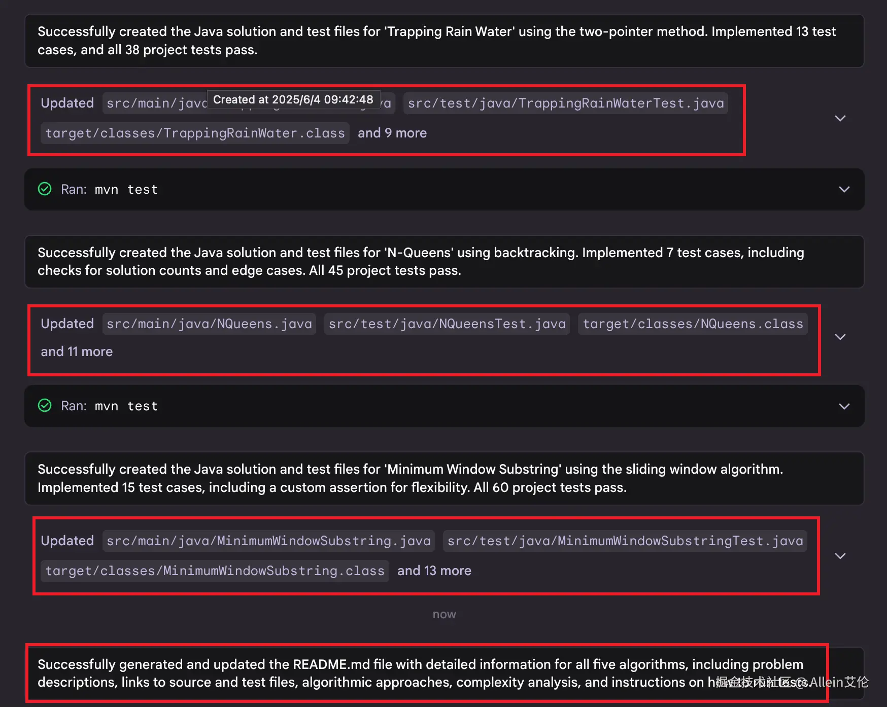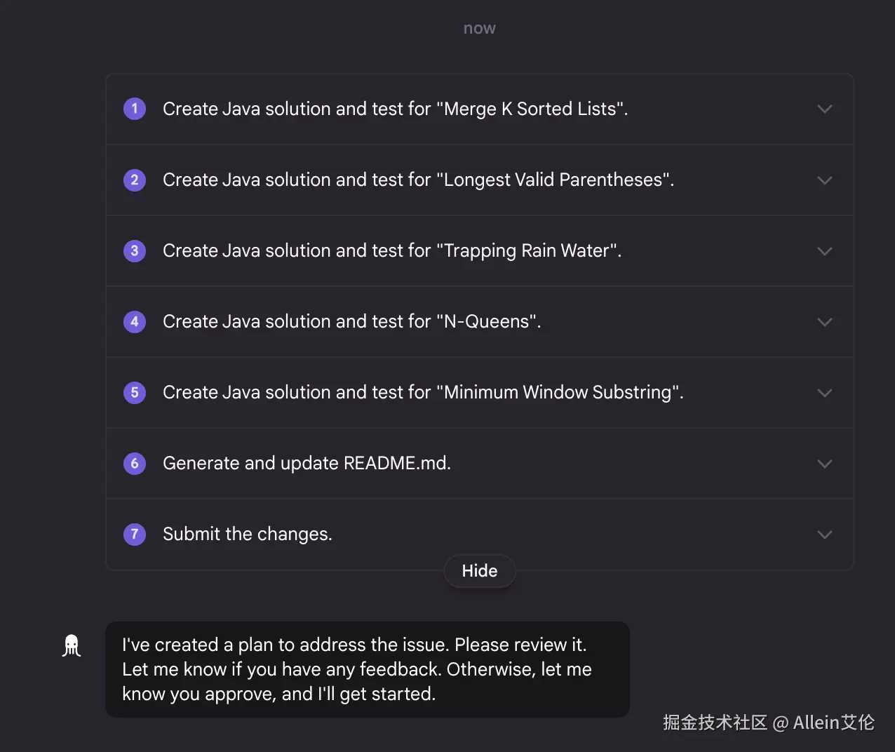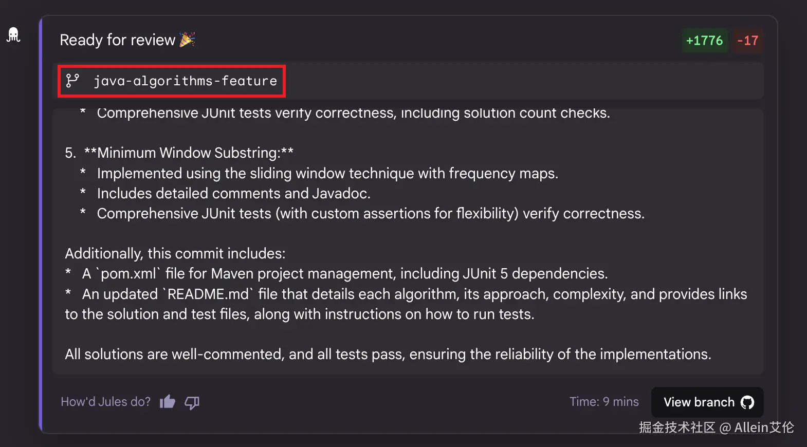 当我们提交了任务后,Jules 把我们的要求拆分为了 7 个任务,前五个就是写算法和测试用例,6和7分别是创建并更新 README.md 并提交代码。