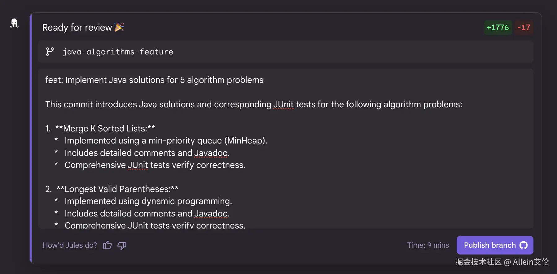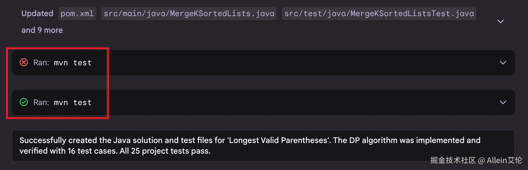 在"最长有效括号"这个算法题目中测试用例报错了,然后 Jules 自己进行了修改并且再次运行了测试用例,通过后给我们返回了成功的标识。