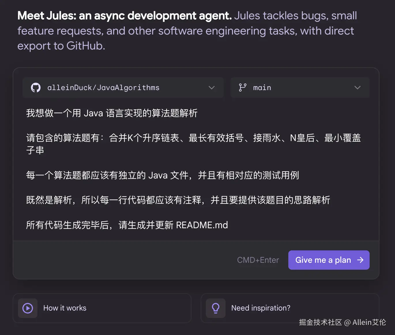 Jules 背后使用的模型肯定是 Gemini,所以这次测试我只想看看是否像他宣传的那样,是一个自主编程不需要人为干预的 Agent。