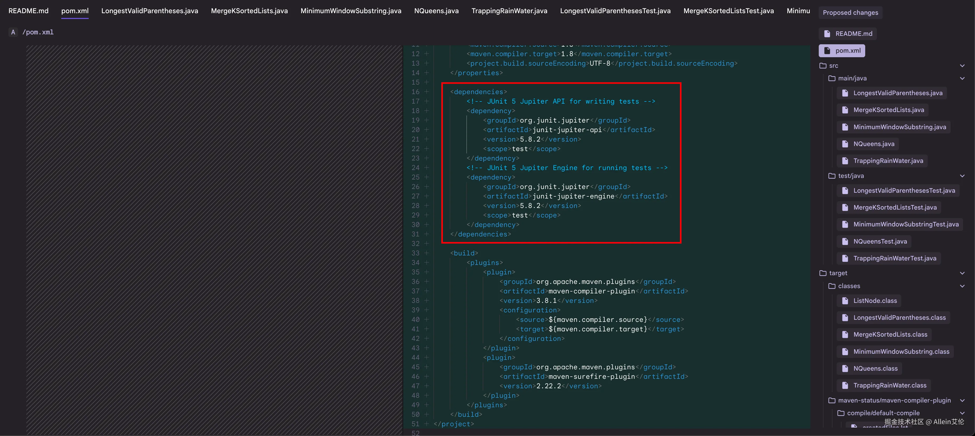 整个任务可不是很难,但相对来说也没有那么的容易。因为它不仅需要理解这 5 个算法题的意思,还要写出对应的测试用例。使用过 Java 的朋友应该都知道,要写测试用例并能运行,就必须要在 pom 文件中引入对应的 junit 依赖。
