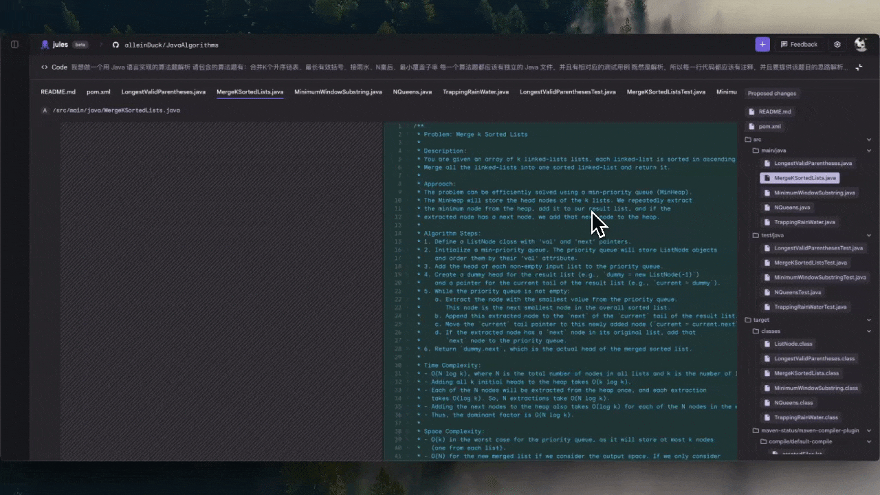 在我们的任务要求中,并没有明确的指出 pom 文件以及引入依赖的要求,所以这都需要 Jules 自己去考虑并进行配置。当然这也是检验它是否能真正独立工作的一个测试。
