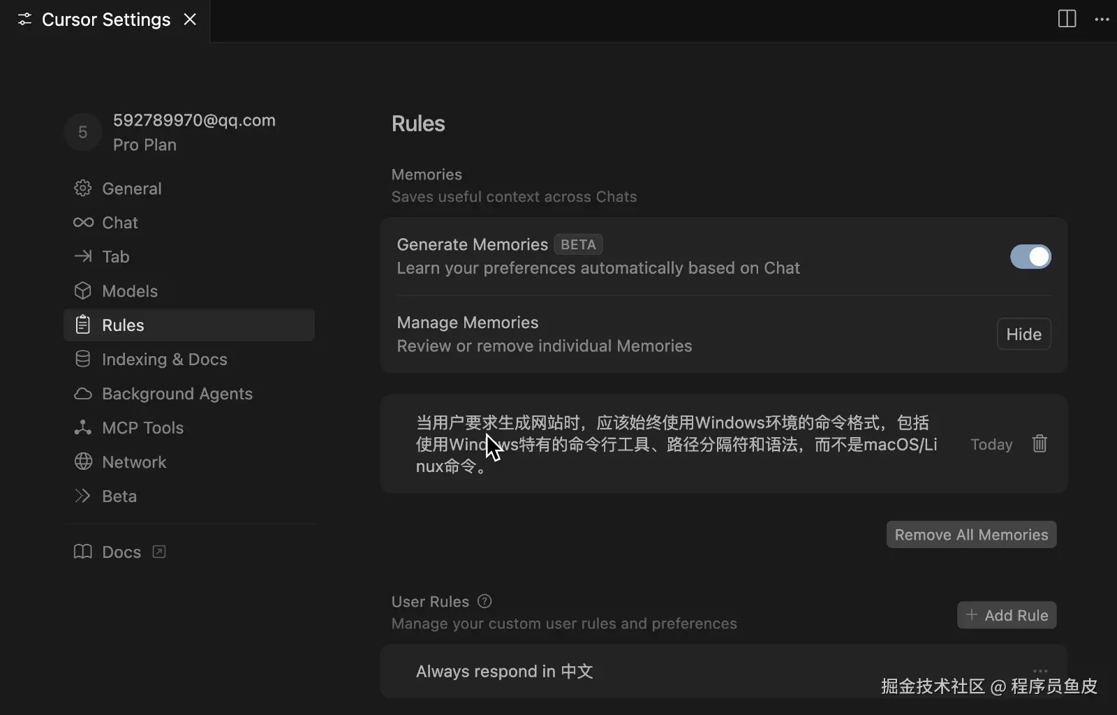 注意,这个记忆功能和上下文对话历史(也就是聊天记录)是有区别的,不是什么都记,更多的是记忆规则。比如我这里让 AI 以后尽量用 Windows 系统的命令来生成代码。