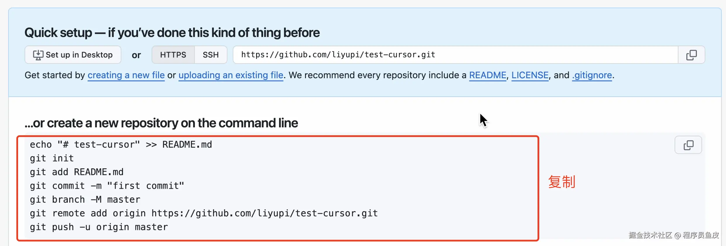 新建仓库完成后,进入仓库,复制关联本地和远程仓库的命令: