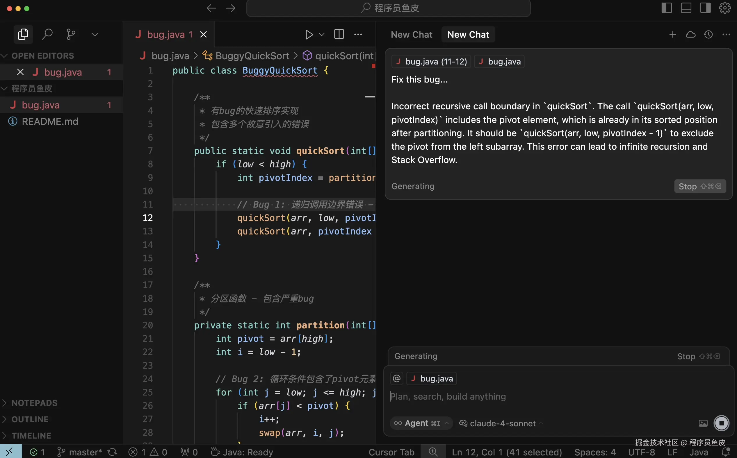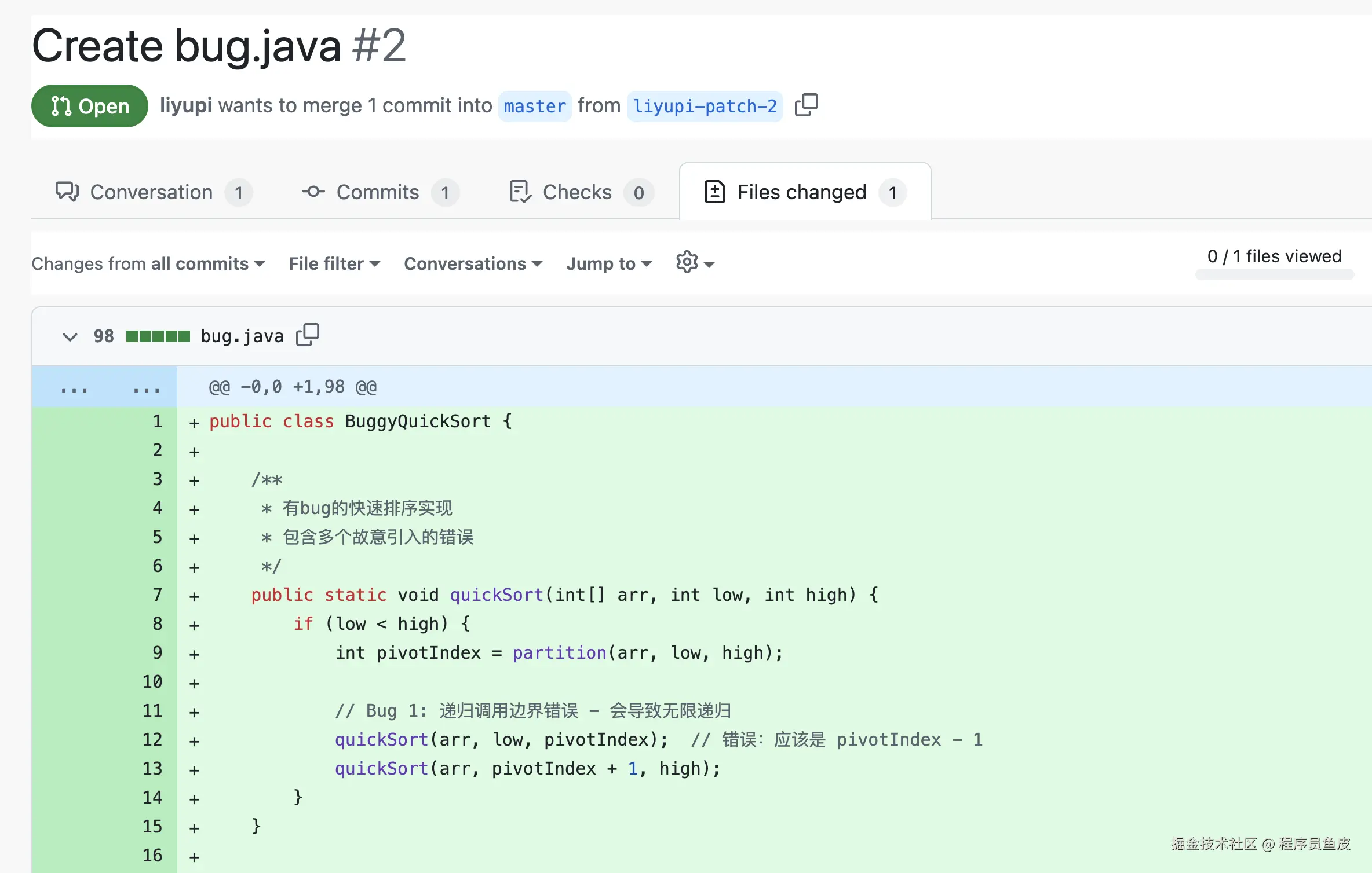 让我们来测试一下,故意提交一个充满 Bug 的 Java 代码文件,发起 PR 代码合并请求。