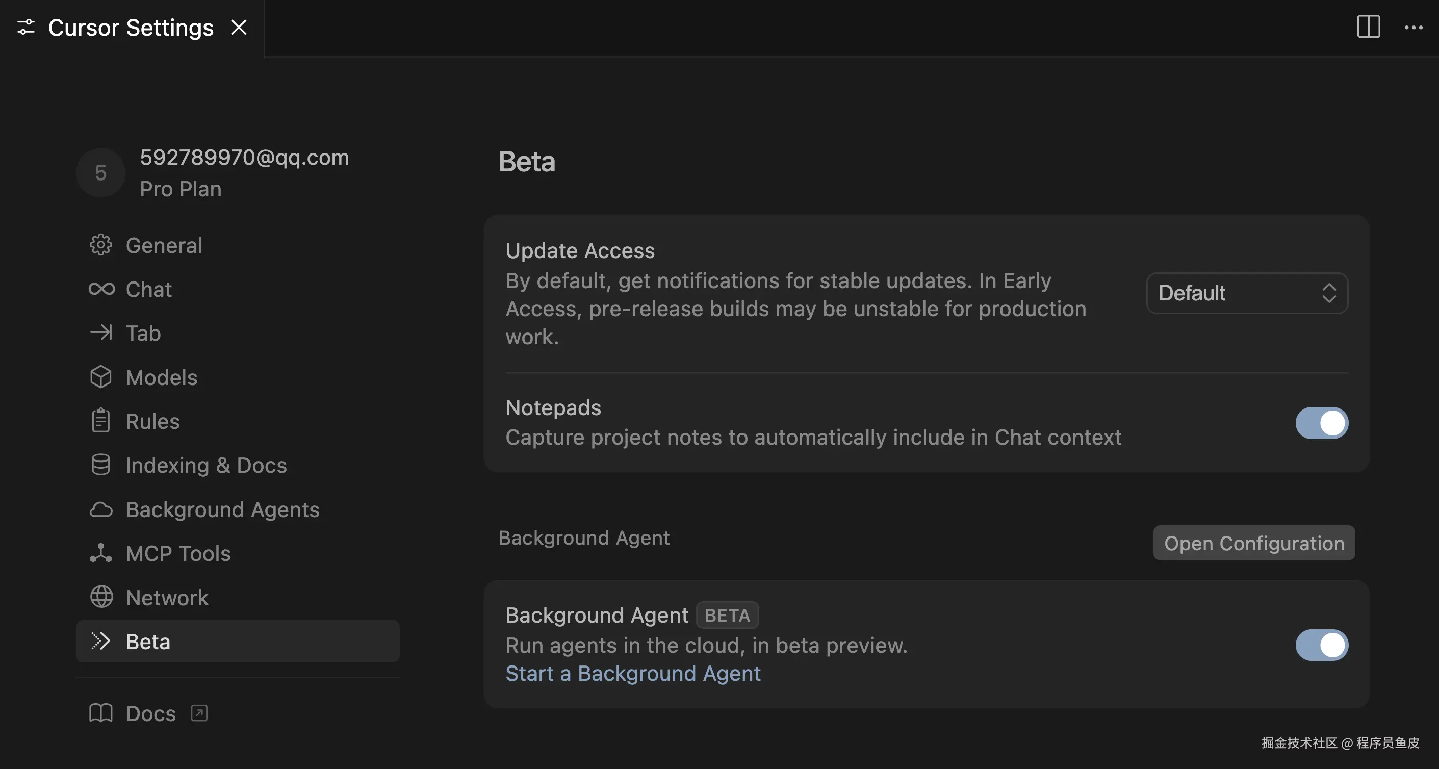 首先进入 Cursor 的设置面板,找到 Beta,开启 Background Agent;但是目前你必须要禁用隐私模式,才能使用它,所以要先在设置中禁用隐私模式。
