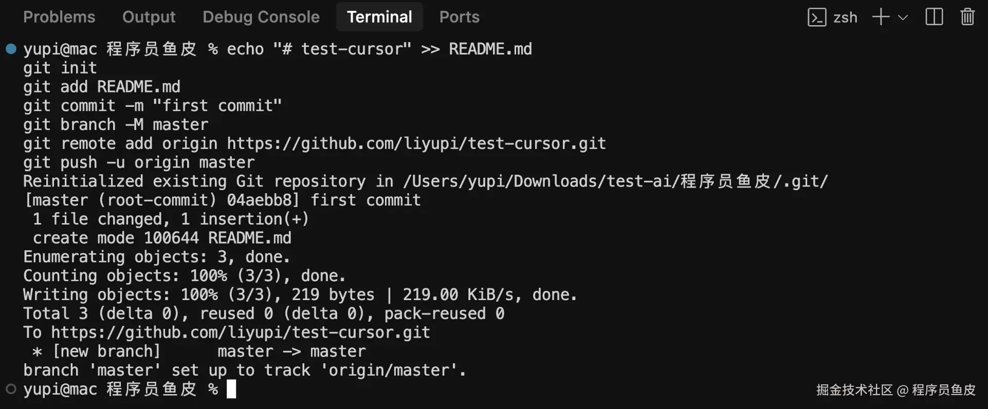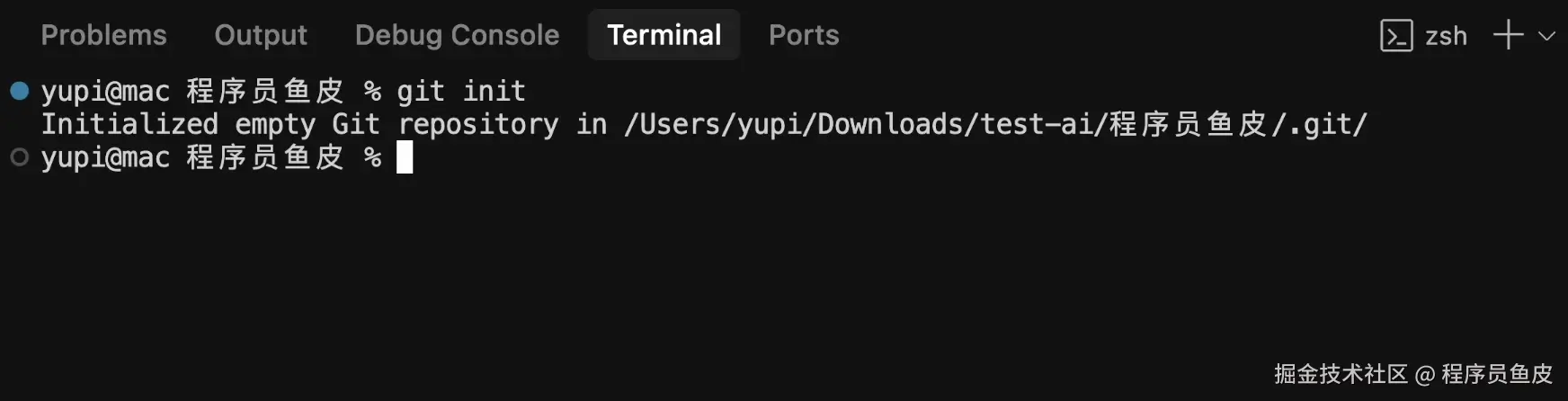然后在 Cursor 中打开终端,执行 git init 命令初始化仓库即可。