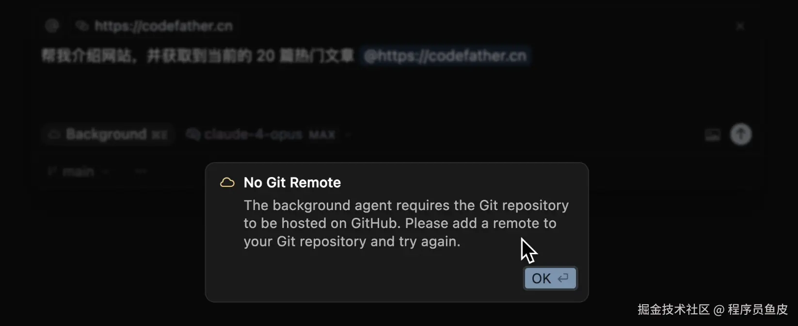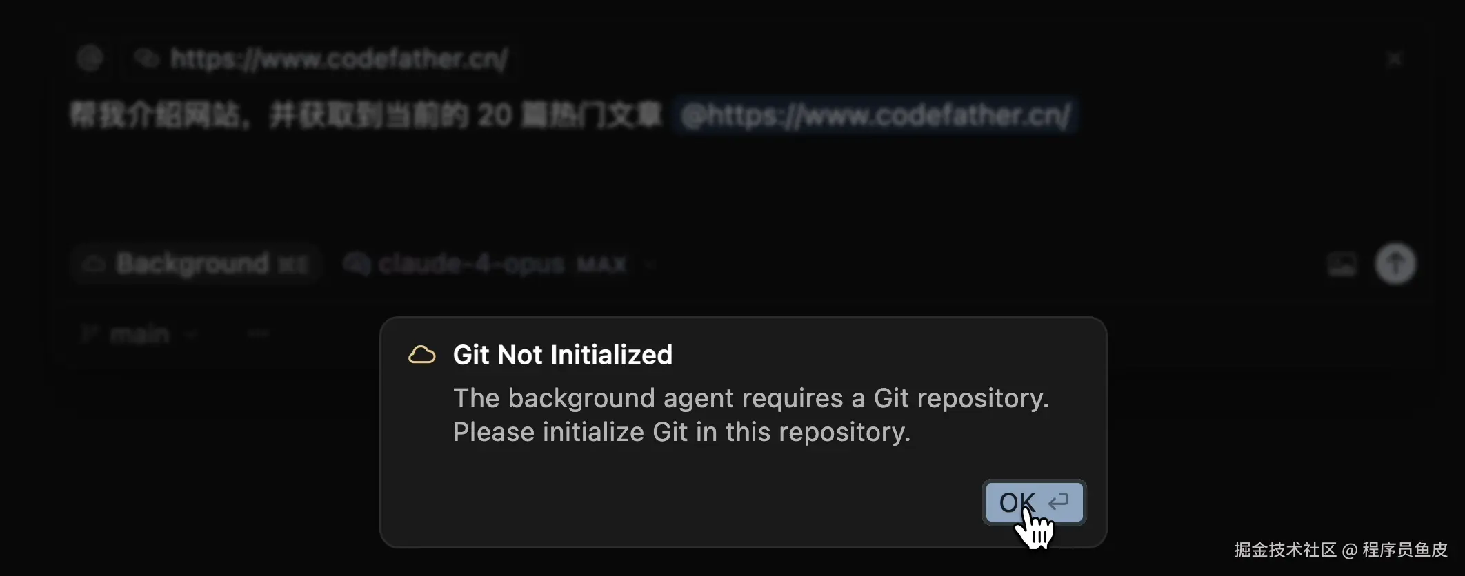 接下来,按 Cmd/Ctrl+E 键打开 Background Agent 模式的 AI 对话框,输入任务后,我们发现,必须要先初始化一个 Git 仓库?