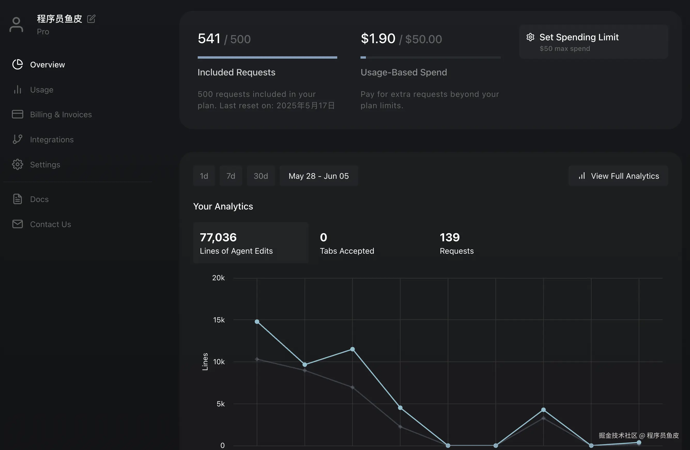 Cursor 还优化了设置和仪表板页面,通过新的仪表板可以查看个人或团队的使用分析,查看按工具或模型分解的详细统计信息。毕竟现在付费项那么多了,也该优化优化了。