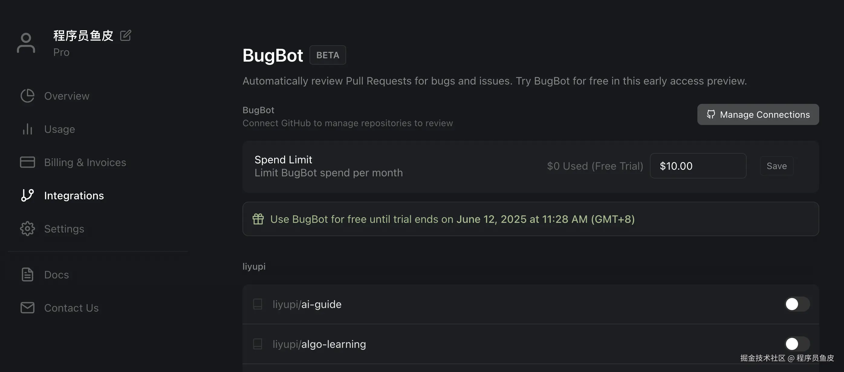我觉得还是挺贵的,所以官方也提醒我们要设置下每月的花费上限。然后选择需要开启 BugBot 的仓库,还可以在进行一些额外配置,比如是否关闭自动执行、只有人工艾特时才执行等。