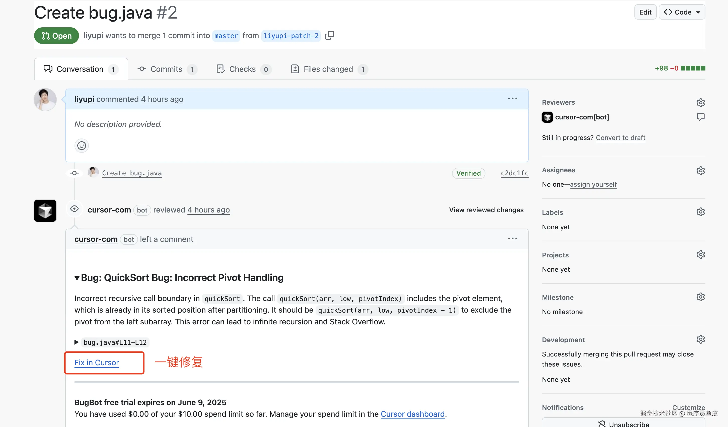 稍等片刻之后,发现 BugBot 留下了评论,它已经找到了 Bug。