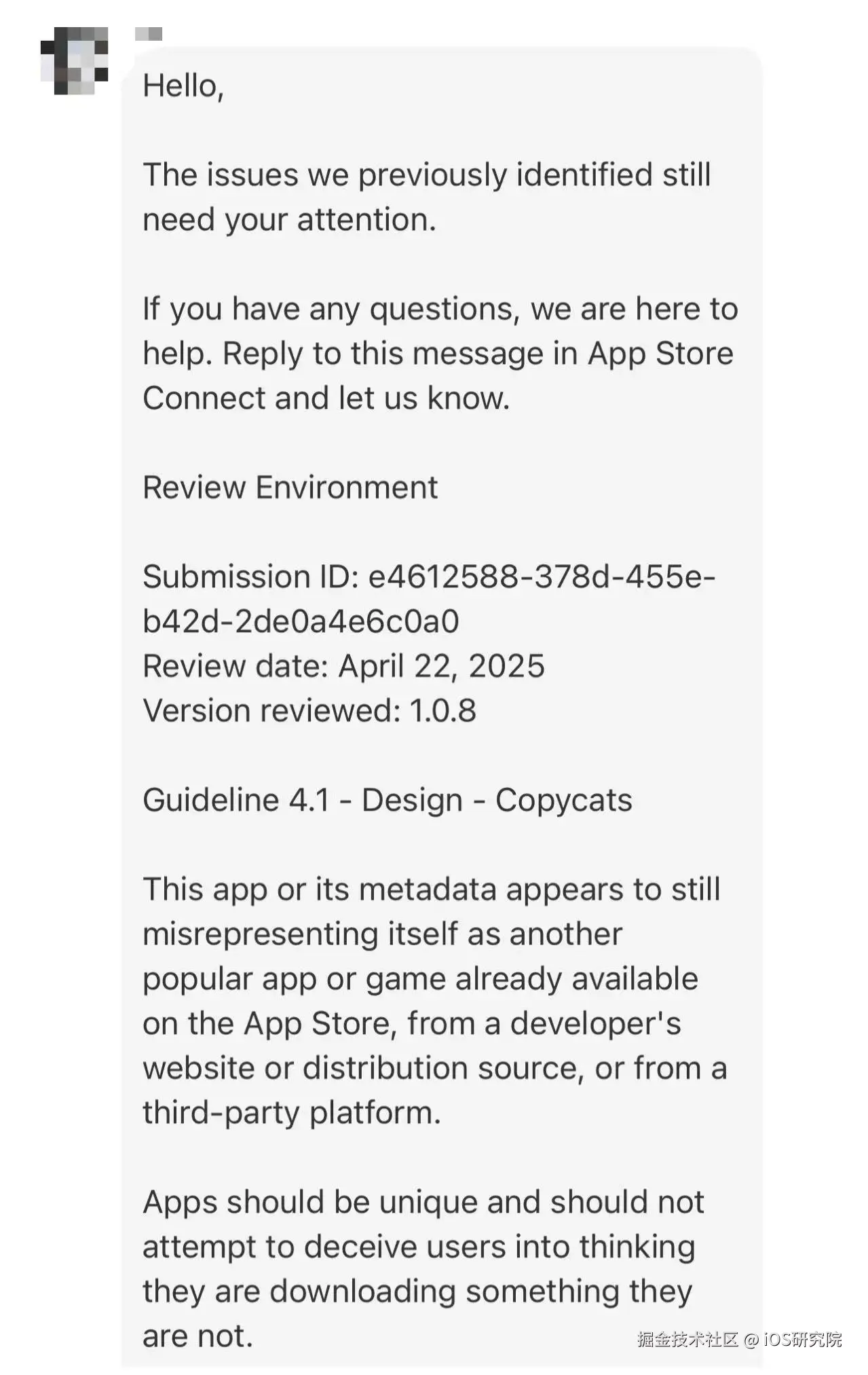 最近后台有留言遭遇了苹果审核被拒Guideline 4.1 - Design - Copycats,需要咨询解惑。