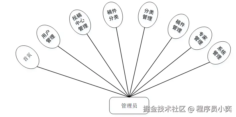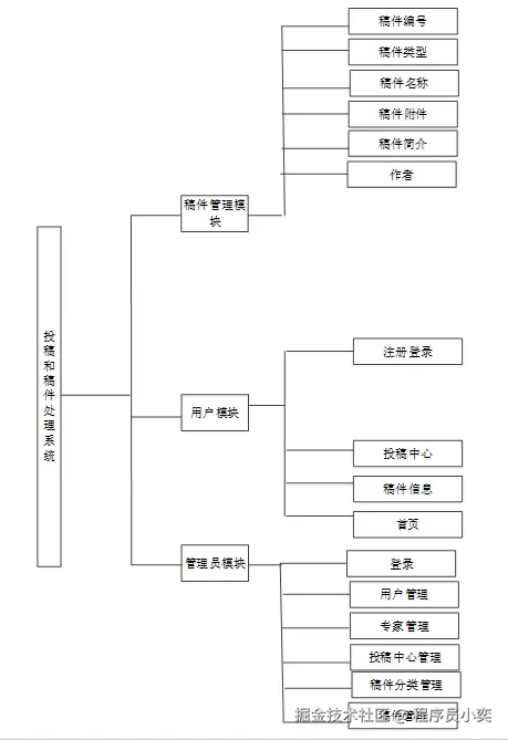 基于投稿和稿件处理系统的设计基于现有的互联网,可以实现管理员:首页、用户管理、在线投稿、稿件分类、稿件管理、专家管理功能模块等。根据系统功能需求建立的模块关系图如下图: