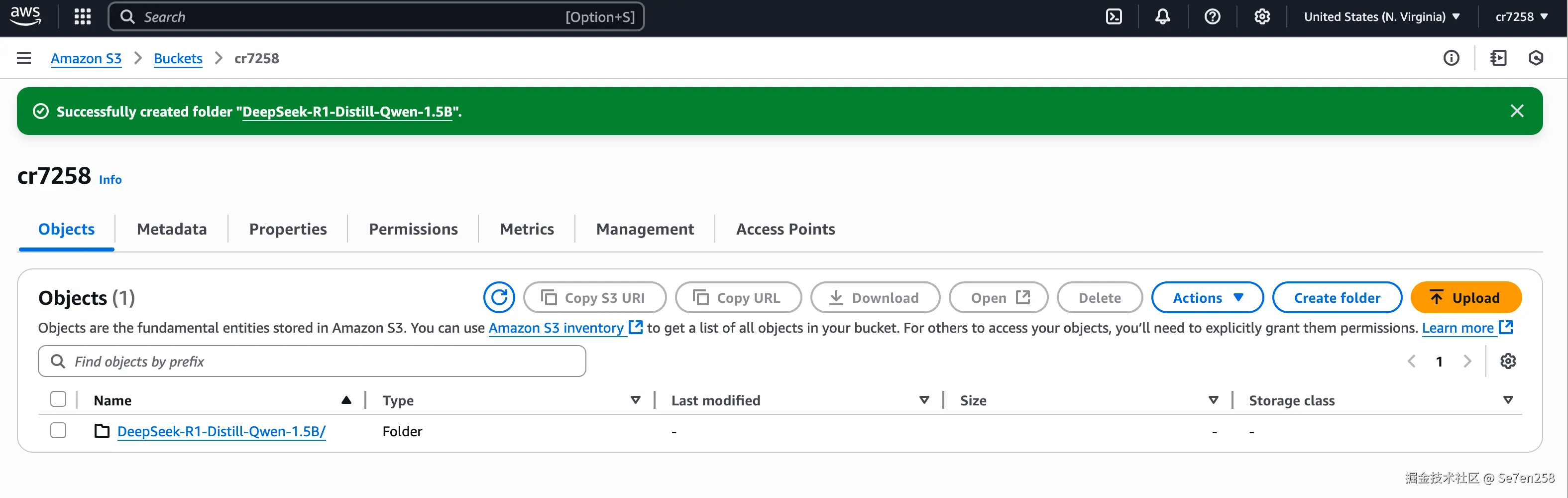 首先在 AWS S3 创建一个 Bucket(本文以 cr7258 为例),并在 Bucket 中创建一个文件夹用于存储模型权重文件(本文以 DeepSeek-R1-Distill-Qwen-1.5B 为例)。