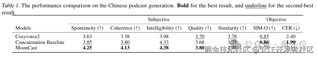实验证明,MoonCast 性能较单句合成模型提升显著,尤其在中英双语长对话播客的自然度和连贯性方面表现惊艳,更接近真人播音效果。