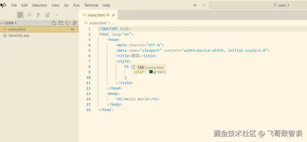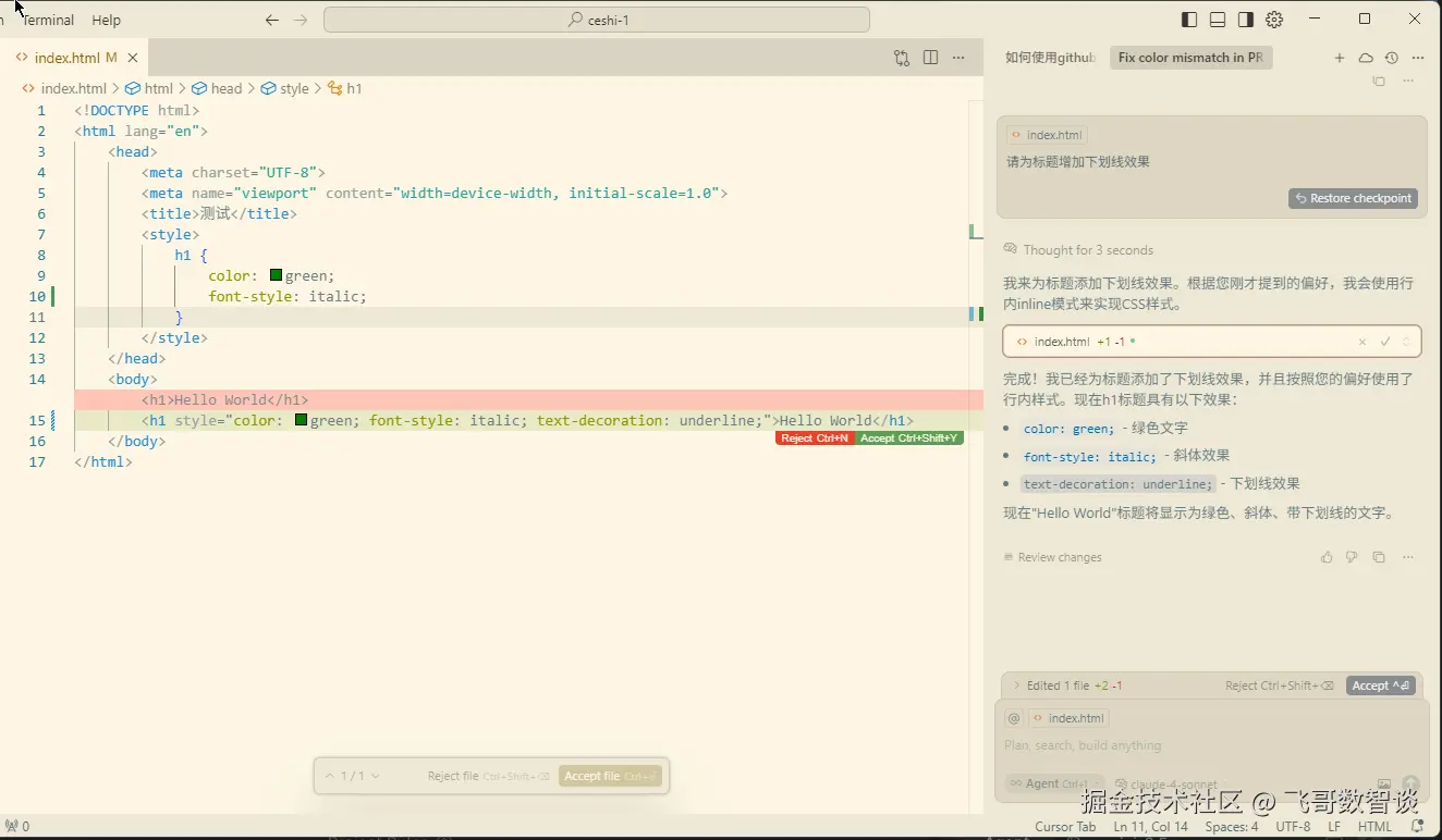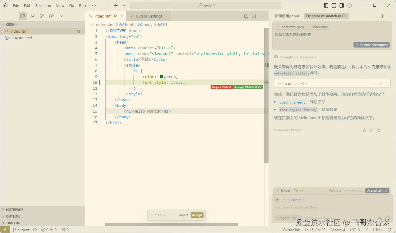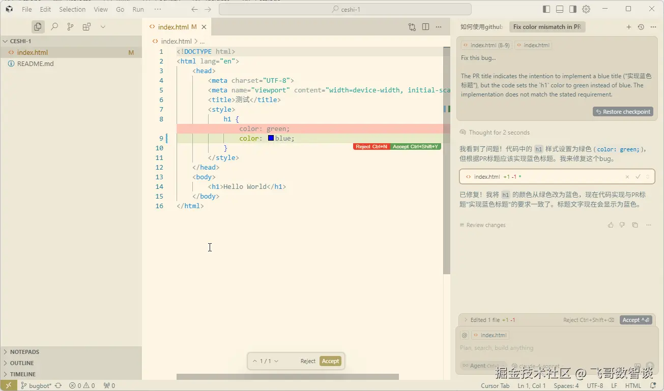 正确需求是将 h1 标签更改为蓝色 blue。而为了测试效果,我故意错误地将 h1 标题改为了绿色 green,然后提交并推送到bugbot分支。